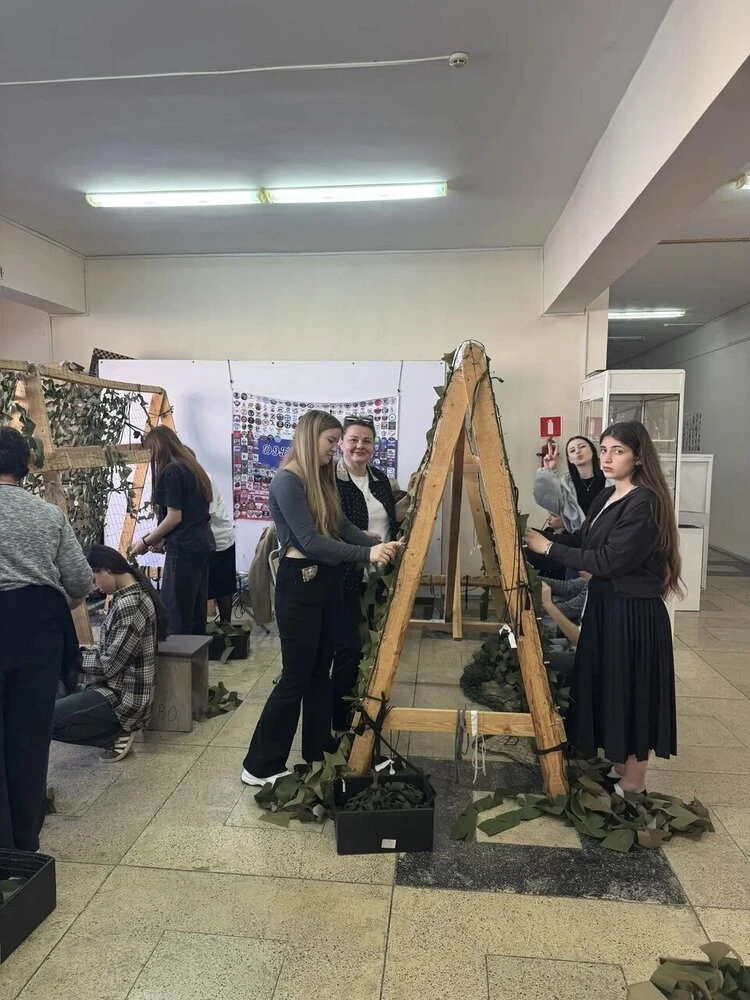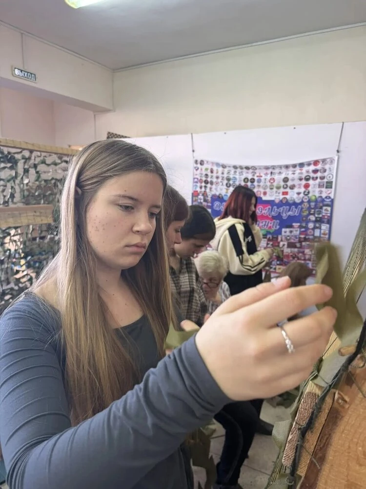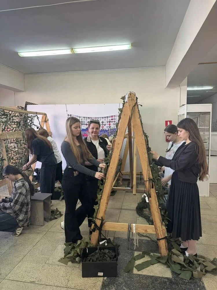 Обучающиеся кружка "Твой выбор", участники волонтерского отряда «Лидер» ЛСТТ помогают в плетении маскировочных сетей для участников СВО.