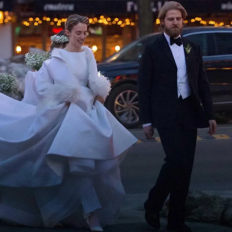 Для церемонии Майя выбрала изысканное белое платье с пышной юбкой и эффектное зимнее пальто с перьями. Жених остановился на классическом смокинге.