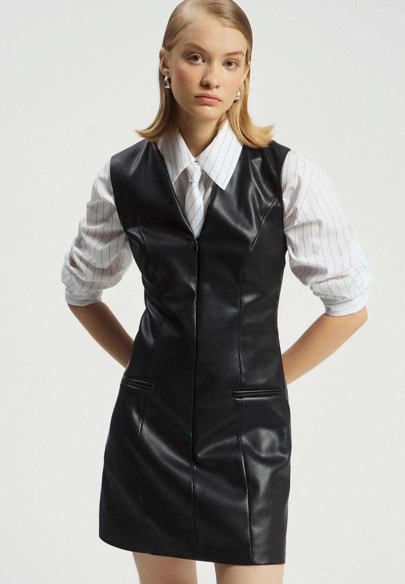 Мягкая, пластичная кожа добавляет дерзости и современности. Юбка с бахромой, расклешенное платье или топ-корсет выглядят сильнее любого глиттера. Аксессуары — матовое золото, архитектурные украшения, тонкие сапоги.