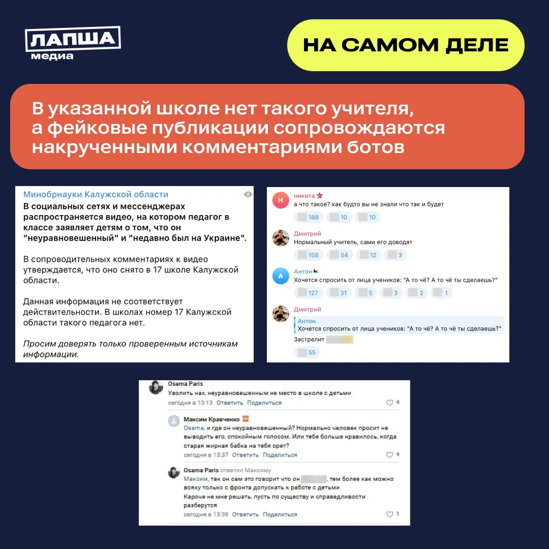 👀 Это фейк. Министерство образования региона уже опровергло информацию: «В школах номер 17 Калужской области такого педагога нет».
