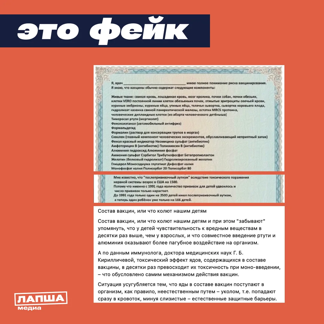 🛑В Сети вновь распространяют пугающие слухи об опасности вакцинации детей — якобы она может привести к развитию аутизма. Сообщения сопровождаются фотографией «официального» бланка о «понимании рисков вакцинации».