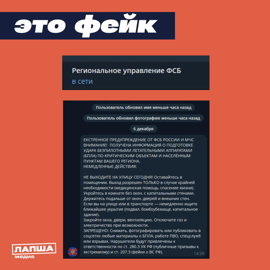 ФСБ и МЧС России якобы предупредили жителей сразу нескольких регионов об ударах БПЛА. Сообщения о поражении критической инфраструктуры и населенных пунктов пришли от ведомств в мессенджеры.