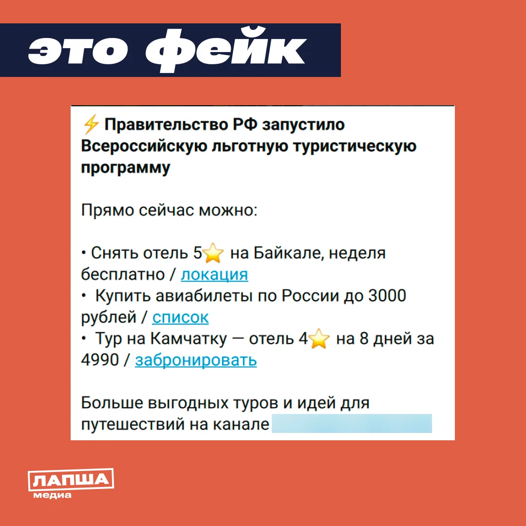 Начнем с того, что это кликбейтная реклама для набора аудитории. Ссылки ведут в закрытые каналы, где таких заманчивых условий, увы, вы не найдете. Так, гостевые дома в низкий сезон на Байкале могут стоить от 2,5 тыс. рублей в сутки. Но это не 5 звезд.