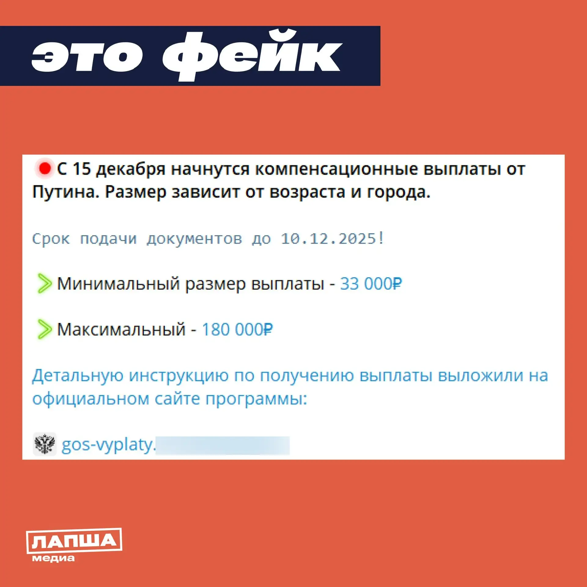 🛑В Сети расходятся слухи о «компенсационных» президентских выплатах гражданам с 15 декабря в размере от 33 до 180 тысяч рублей. Узнать размер суммы якобы можно по специальной ссылке.
