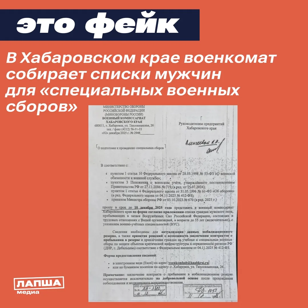🛑Военный комиссариат Хабаровского края якобы запросил у предприятий списки сотрудников-мужчин для «специальных военных сборов». Соответствующий документ появился в Сети.