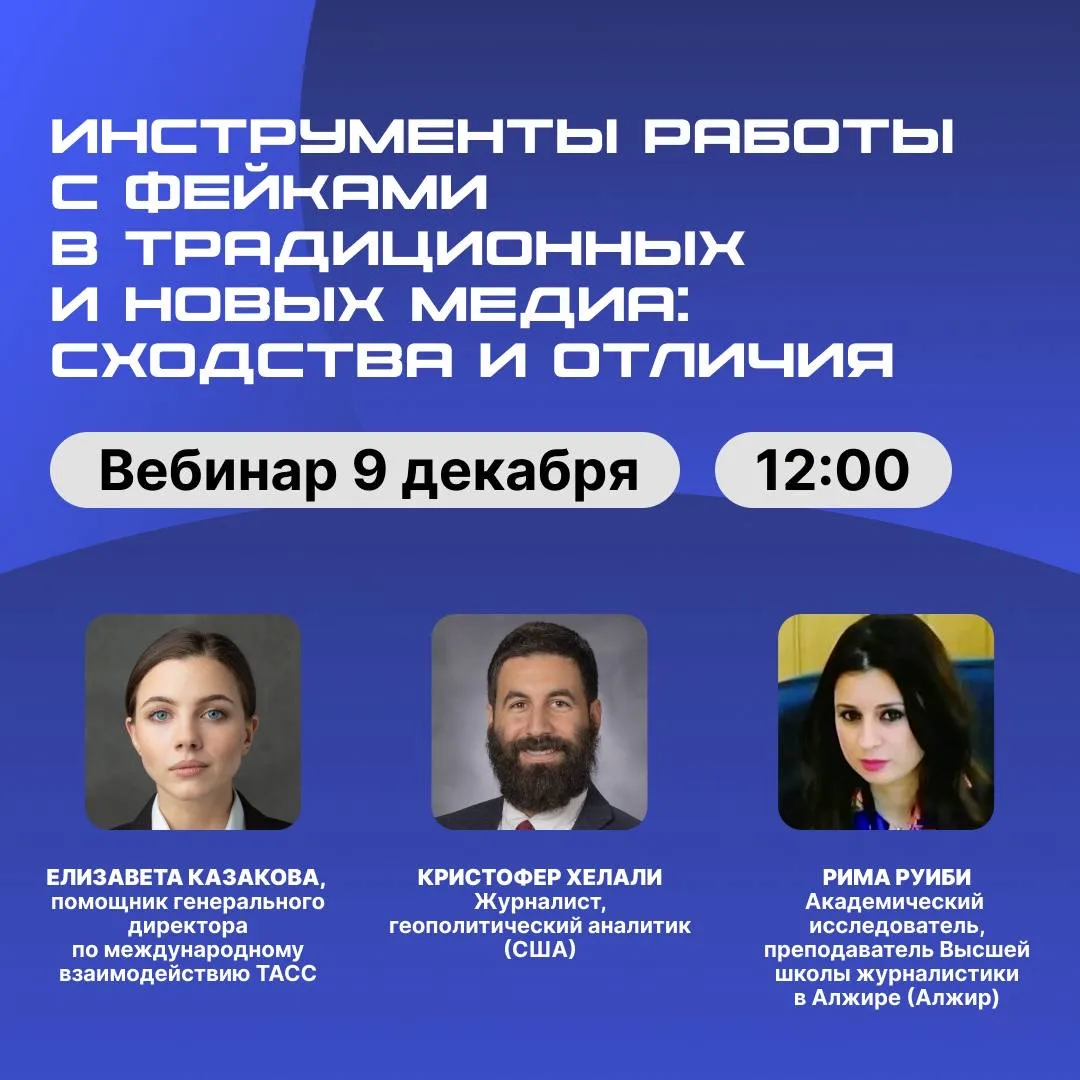 Спикерами семинара станут три эксперта — из России, США и Алжира, которые обсудят темы, связанные с инструментами работы с фейками в традиционных и новых медиа: