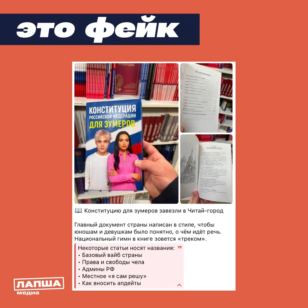 Фотографии «конституции», вероятно, чья-то шутка. Они выглядят правдоподобно, но не подтверждаются ни издательскими каталогами, ни реальными полками магазинов. Тем не менее фейк быстро стал вирусным — на него отреагировали и депутаты Госдумы: одни «поддержали идею», другие «резко осудили».
