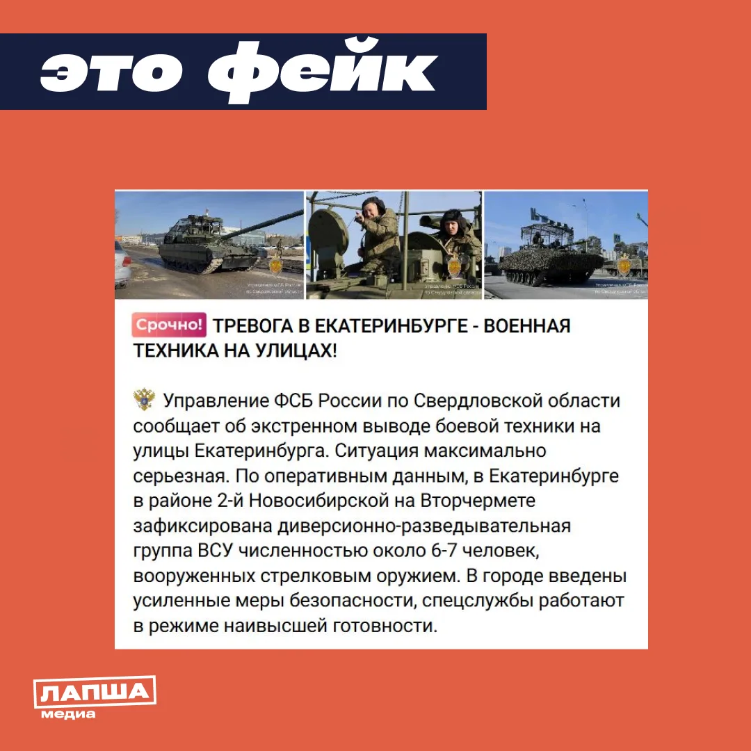 Военная техника вышла на улицы Екатеринбурга в рамках репетиций парада Победы. Это обычная практика — отрабатывать маршруты заранее. Авторы фейка взяли видеозаписи с репетиций и выдали их за «антитеррористическую операцию».