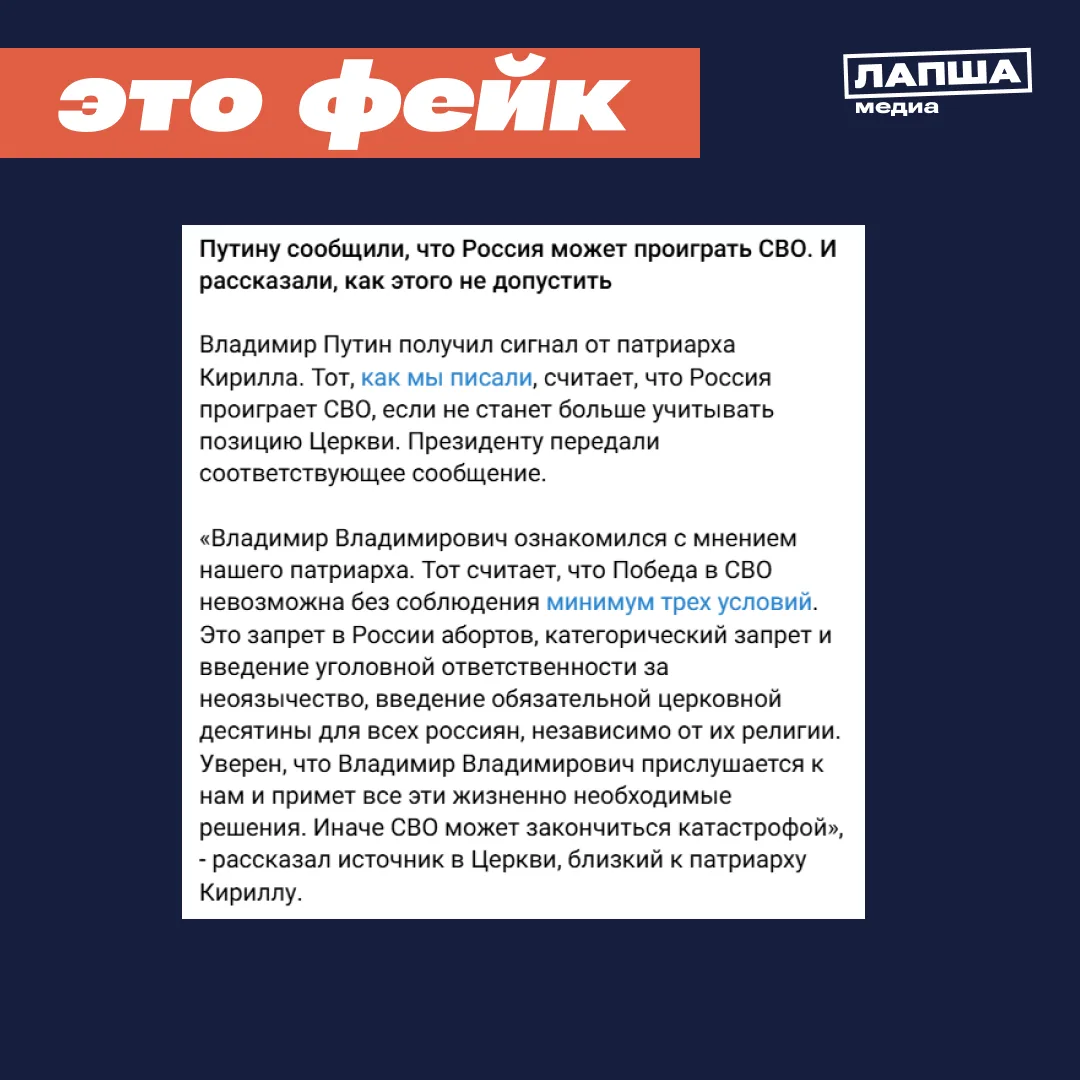 🛑 Патриарх Кирилл якобы предупредил президента России Владимира Путина о неизбежном поражении в СВО, если не будут выполнены три условия: запрет абортов, уголовное наказание за неоязычество и введение церковной десятины для всех граждан. Такая сомнительная история появилась в тг-каналах.