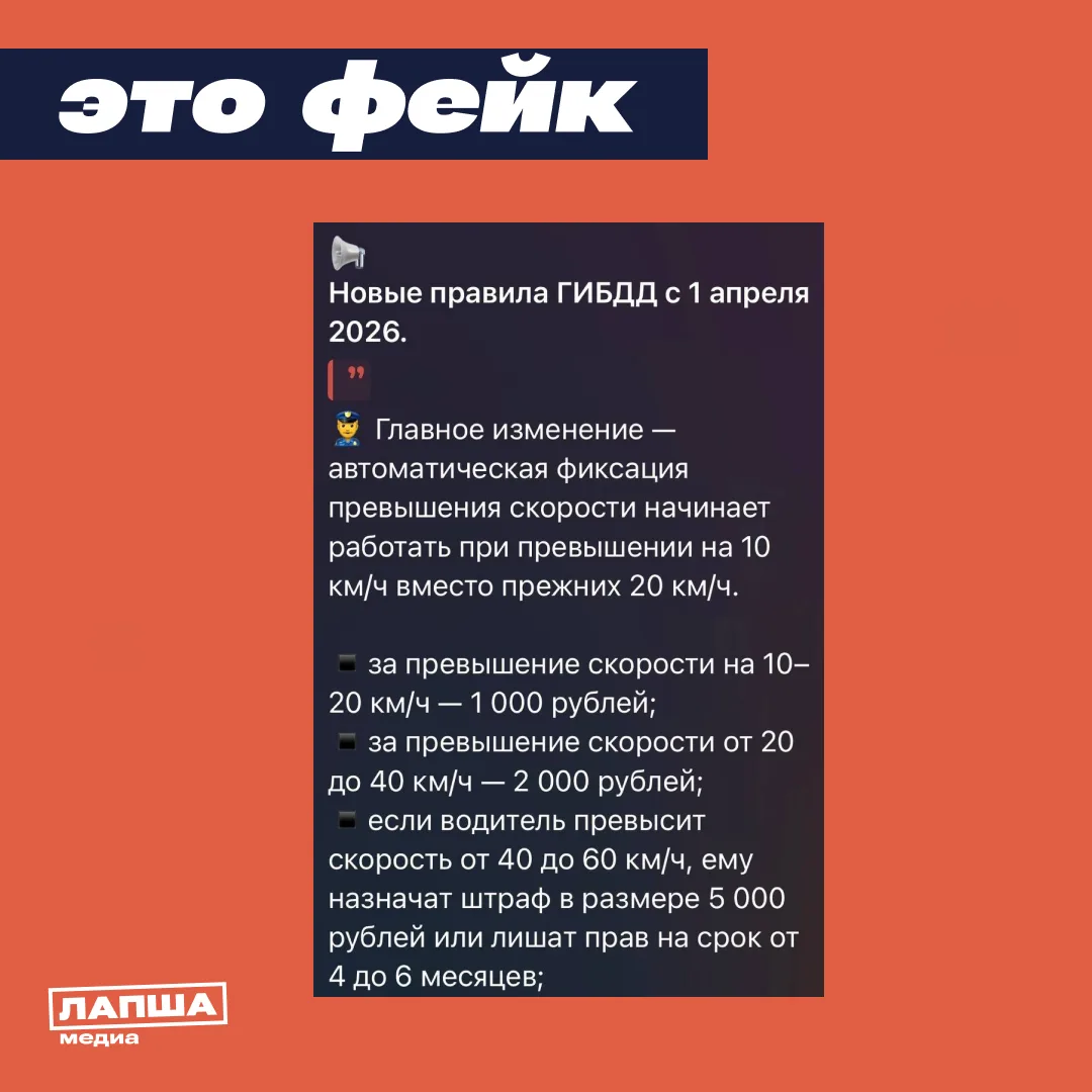 🛑 В Сети пишут, что с 1 апреля в России начнут наказывать за превышение скорости на 10 км/ч, а не на 20. При этом за три повторных нарушения в течение года водителя якобы временно лишат прав и оштрафуют до 5 тыс. рублей.