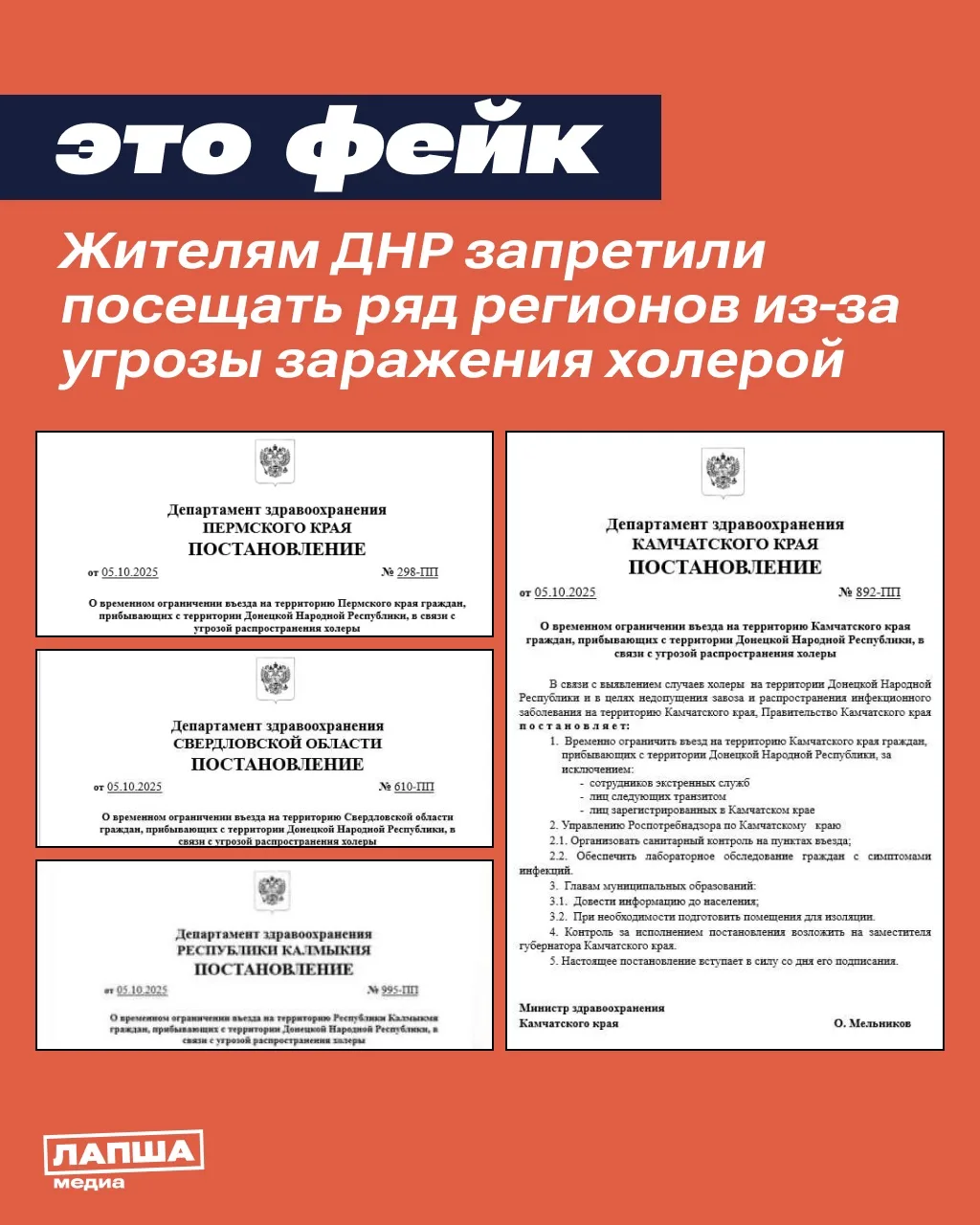 🛑В Сети появились фейковые постановления о запрете въезда жителям ДНР в некоторые регионы РФ из-за угрозы холеры. Документы распространяются от лица департаментов здравоохранения Камчатки, Калмыкии, Свердловской области и Пермского края.