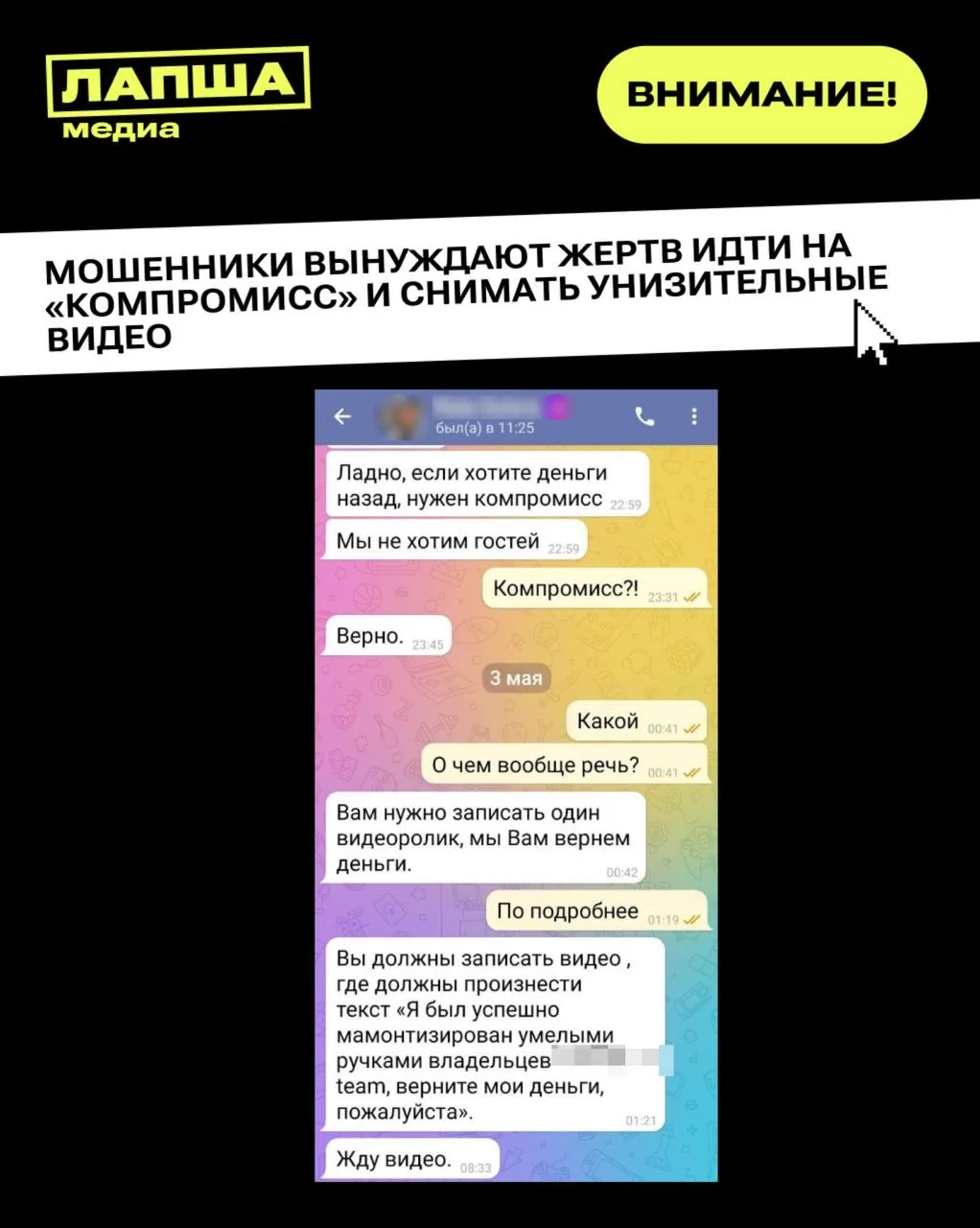 Злоумышленники продолжают насмехаться над обманутыми людьми, предлагая «вернуть» средства в обмен на унизительные видео с заученными фразами под видом «компромисса». Эти ролики аферисты используют в дальнейшем не только для издевательств, но и для рекламы, чтобы привлекать новых «сотрудников» в преступные схемы.