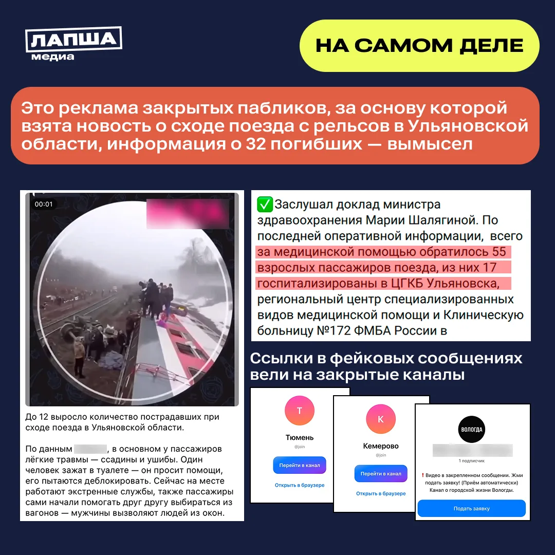 За основу сообщений было взято недавнее ЧП, произошедшее в Ульяновской области. Утром 3 апреля поезд Москва — Челябинск сошел с рельсов. К счастью, обошлось без жертв, за помощью обратилось 55 взрослых, из них 17 госпитализированы в ЦГКБ Ульяновска, сообщил глава региона.