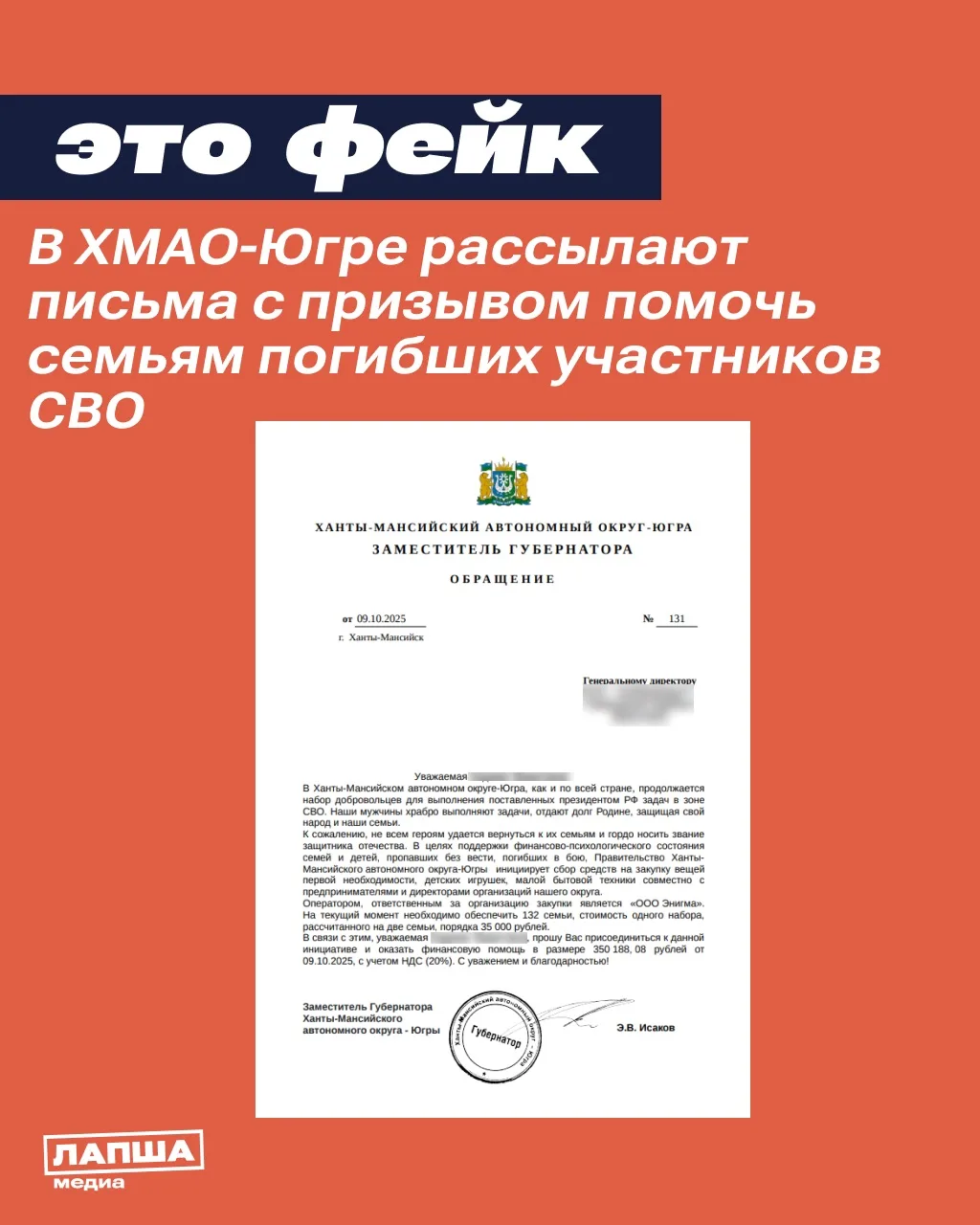 🛑В ХМАО-Югре распространяются письма с призывом оказать материальную поддержку семьям погибших бойцов СВО. Якобы заместитель губернатора региона обращается к конкретным людям с просьбой о пожертвовании определенной суммы.