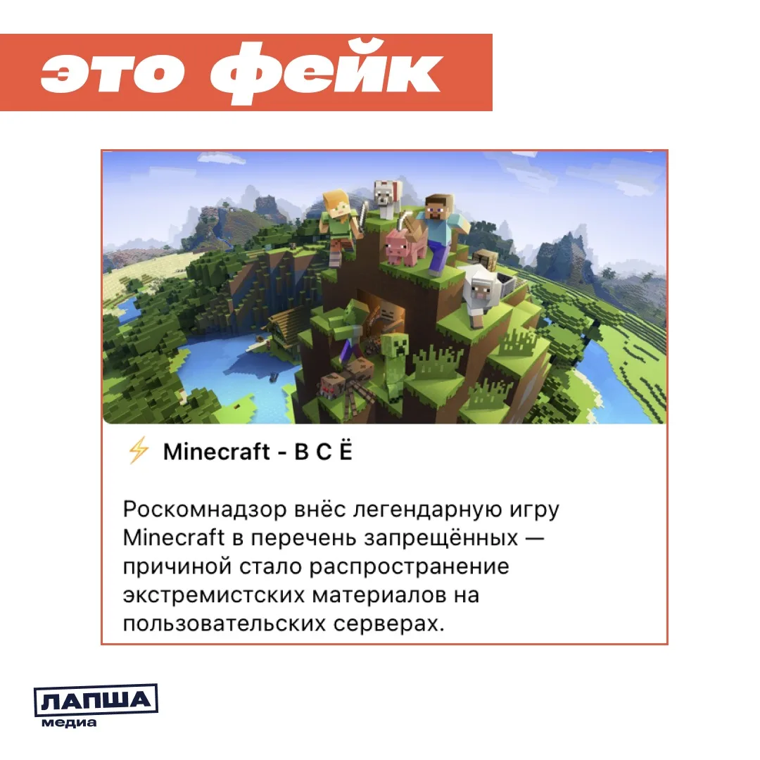 🛑В Сети распространяется «новость», что Роскомнадзор внёс игру Minecraft в перечень запрещённых. При этом якобы даже председатель СК РФ уже выступил против запрета игры.
