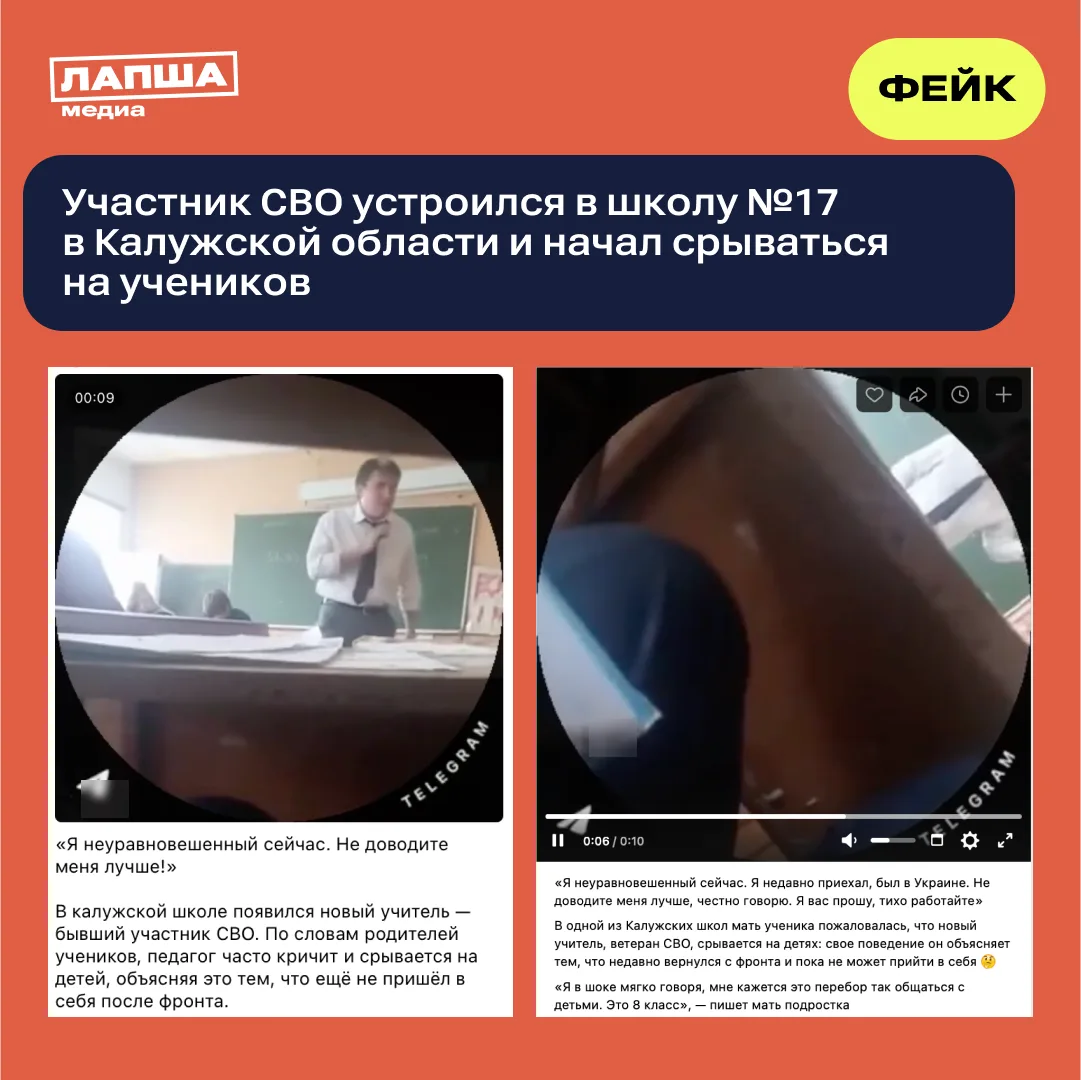 🛑 В пабликах и тг-каналах распространяется видео, в котором якобы преподаватель школы №17 в Калужской области запугивает учеников. По словам авторов ролика, он бывший участник СВО и именно поэтому такой «неуравновешенный».