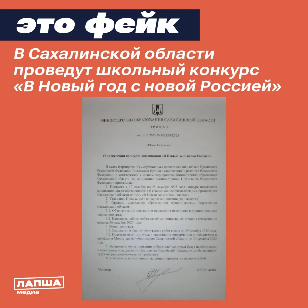 🛑Школьный конкурс аппликаций «В Новый год с новой Россией» якобы пройдет в Сахалинской области. Приказ о проведении мероприятия распространяется от имени регионального Министерства образования, утверждается, что работы победителей войдут в новогоднее поздравление президента России.