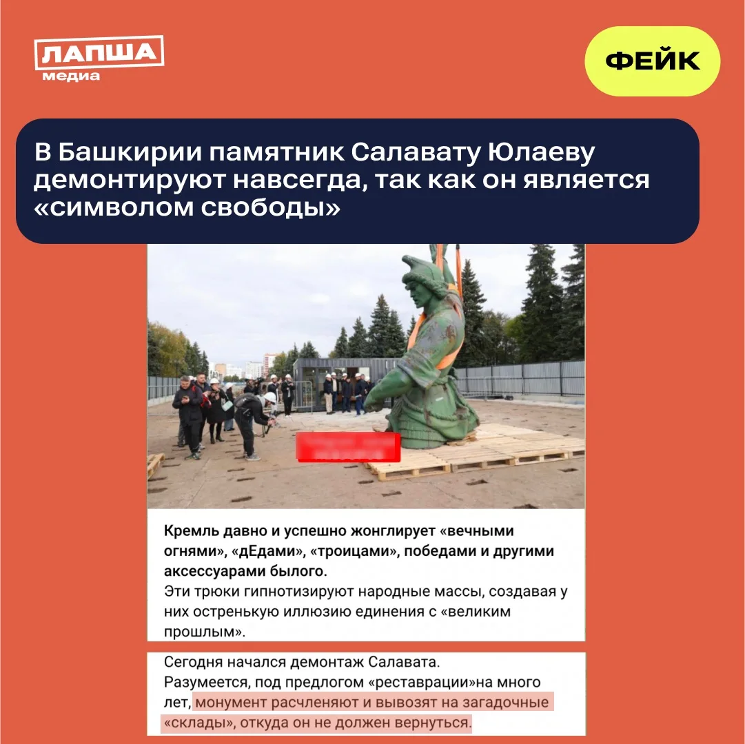🛑В Уфе памятник национальному герою Салавату Юлаеву демонтируют якобы по политическим причинам. Информация появилась в канале российского репортера и политика, признанного иноагентом.