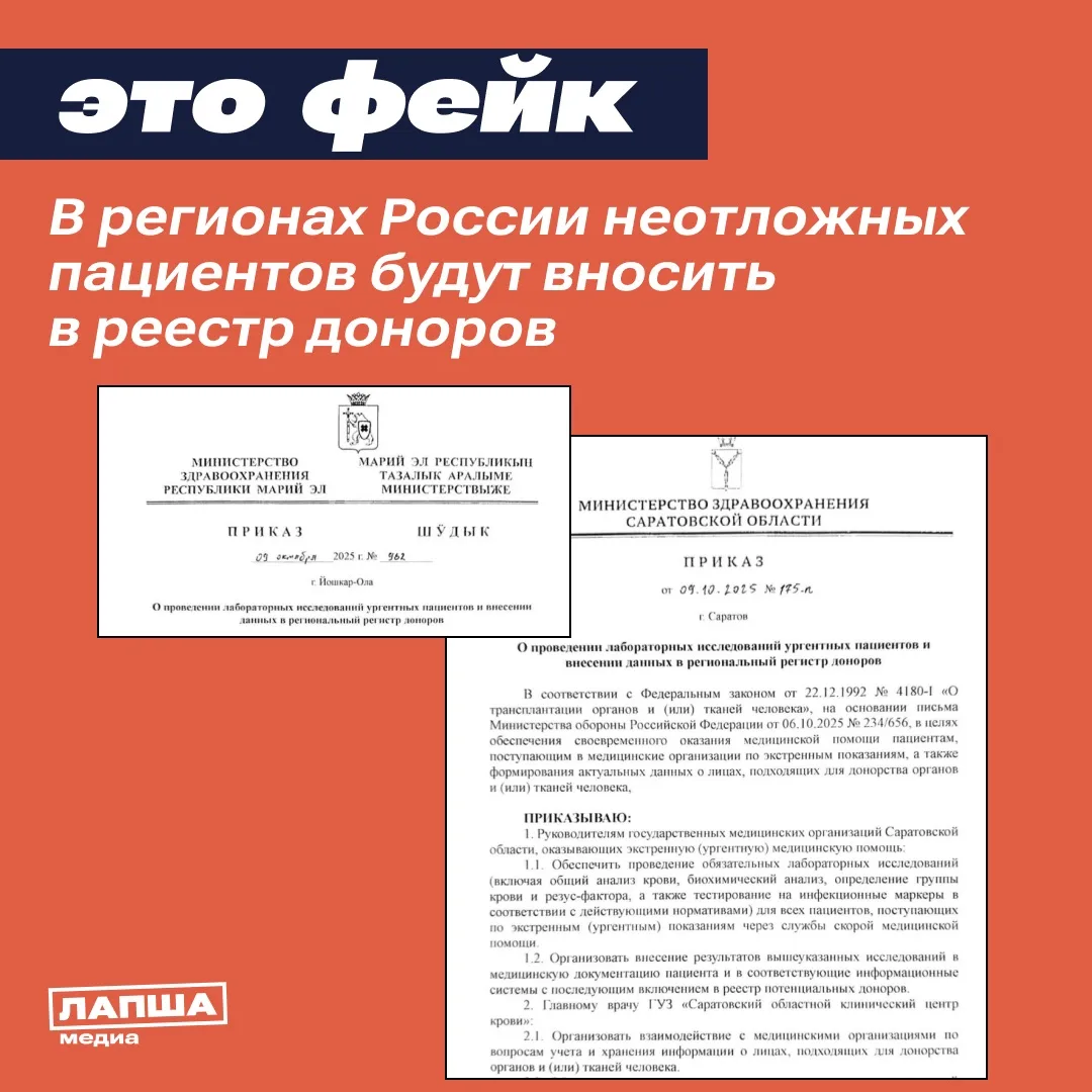 🛑 В Сети распространяется фейк, что в некоторых регионах России у неотложных пациентов начнут собирать анализы и вносить их данные в реестр потенциальных доноров.