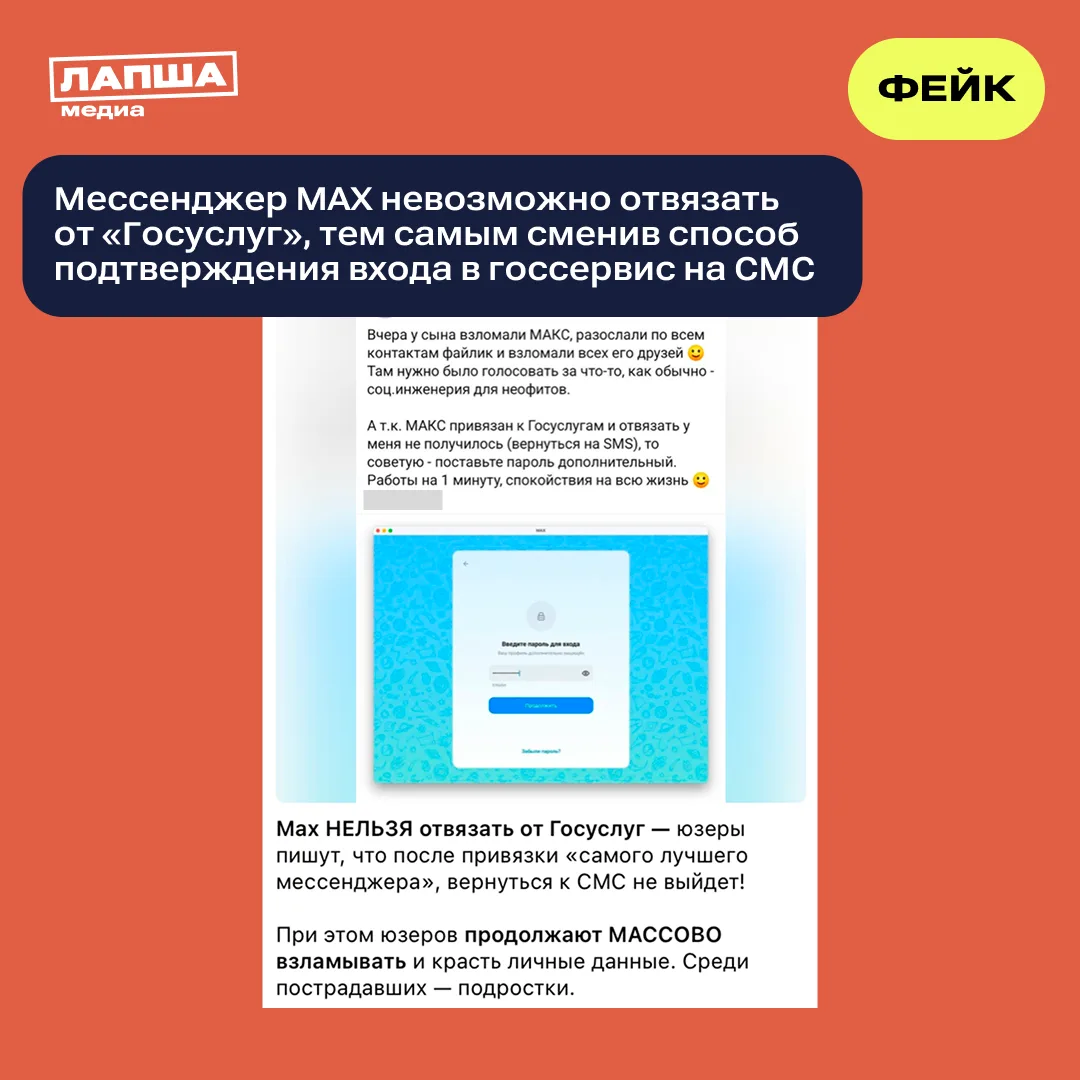 🛑 «Лапша Медиа» наткнулась на пост, где пишут, что аккаунт MAX нельзя отвязать аккаунт от госсервиса и вернуться ко входу через СМС невозможно.