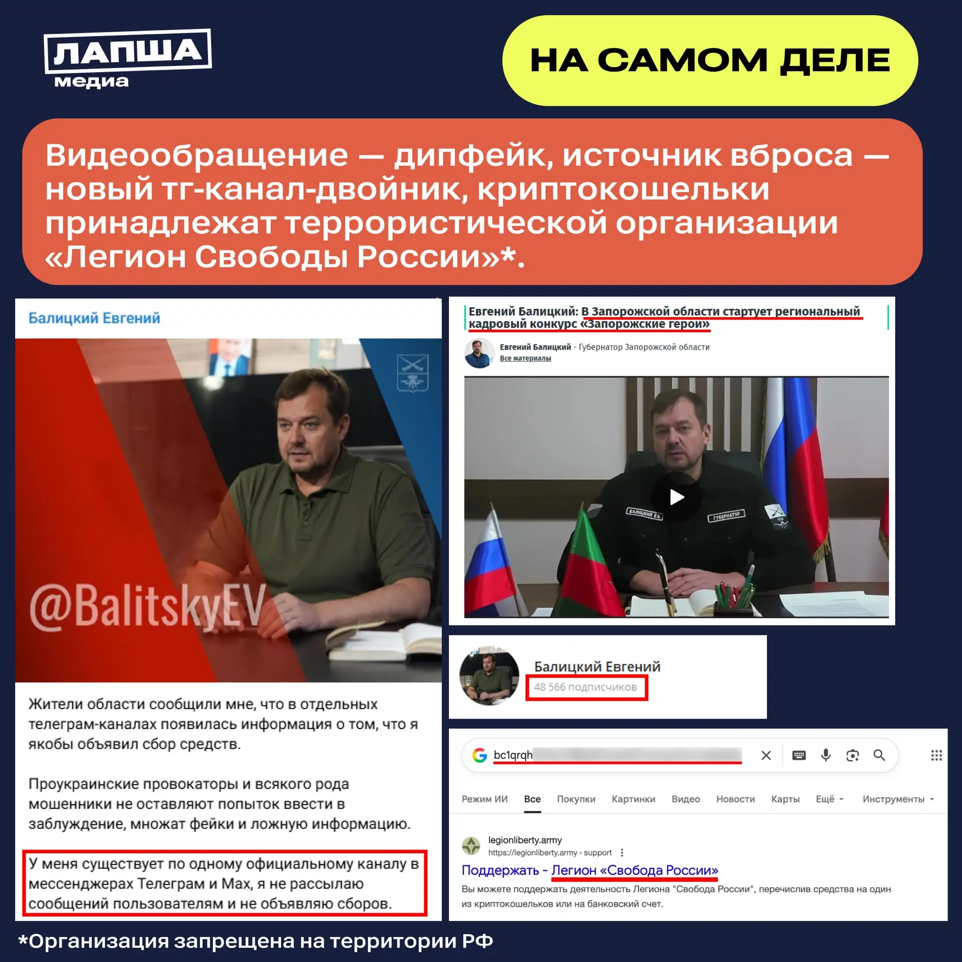 За распространением подделки также были замечены боты, которые занимались рассылкой однотипных сообщений. Вероятно, вброс был собран на скорую руку — поддельное видео «украшает» надпись крупными буквами «губеранатор».