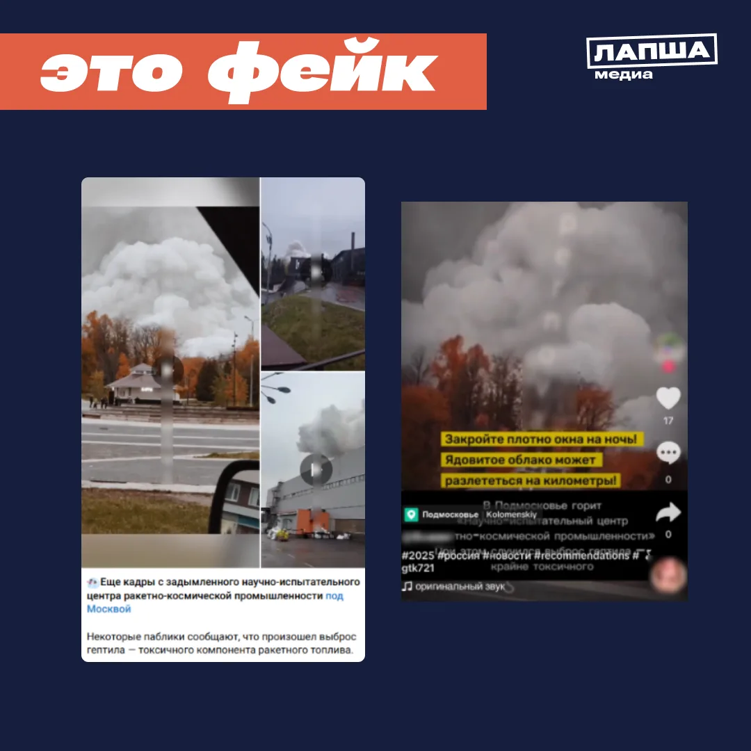 🛑В соцсетях распространяется фейк о выбросе гептила в результате возгорания «Научно-испытательного центра ракетно-космической промышленности» (НИЦ РКП) в Подмосковье.