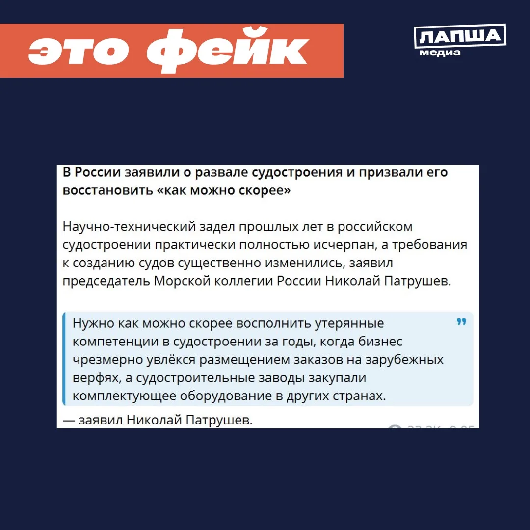 🛑В Сети распространяется фейк о якобы «развале судостроения в России». Авторы публикаций утверждают, что о кризисе отрасли заявил помощник президента РФ, председатель Морской коллегии РФ.