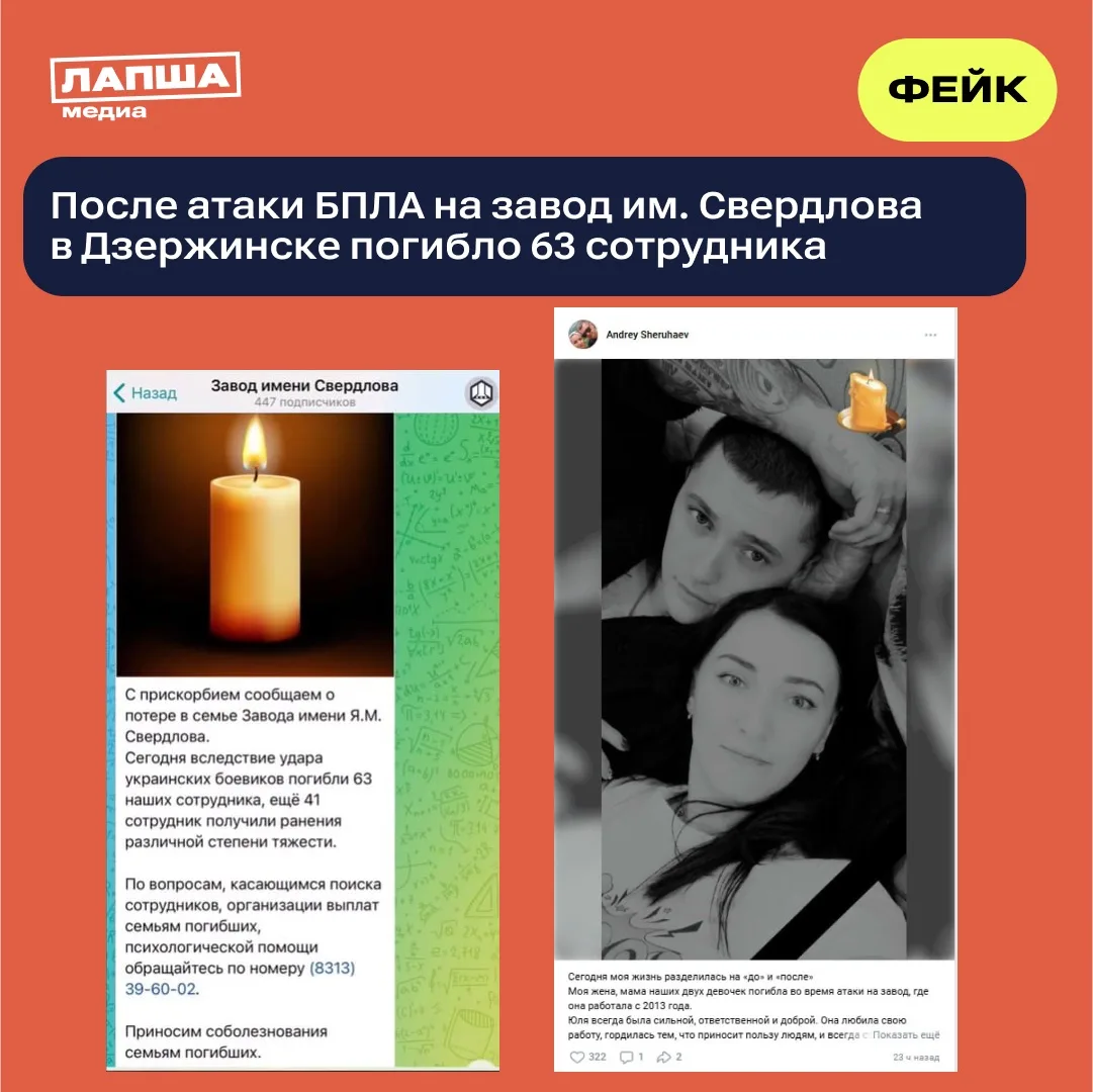 🛑В Сети распространяются ложные сообщения, что в результате атаки БПЛА на завод имени Свердлова в Дзержинске, погибли 63 работника. «Фальшивый муж» одной из сотрудниц утверждает, что девушка скончалась в реанимации от тяжелых ранений.