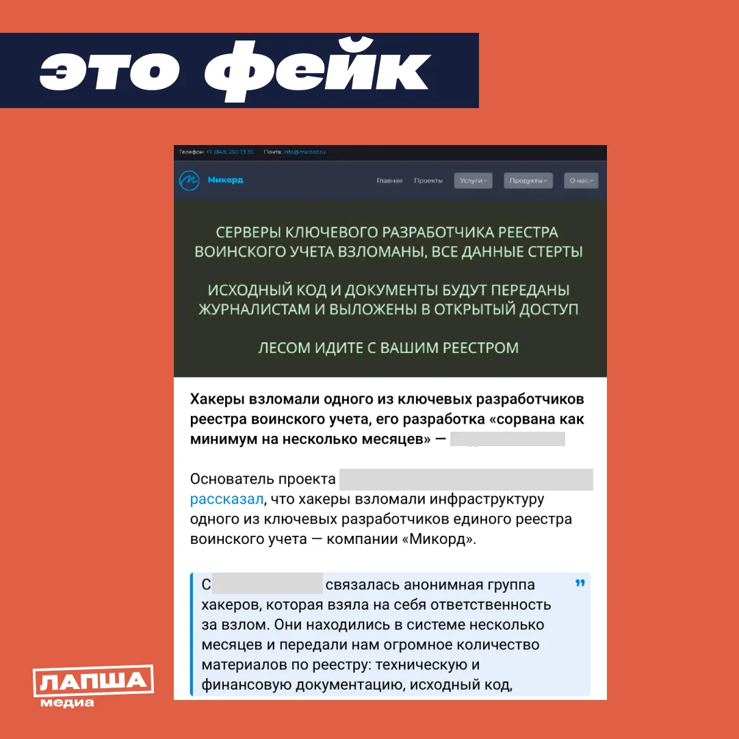 🛑 «Воинский реестр взломали» — анонимная хакерская группа заявила, якобы обошла защиту одного из ключевых разработчиков единого воинского учета «Микорд». Утверждается, что данные были украдены и уничтожены, а работа серверов «сорвана как минимум на несколько месяцев».