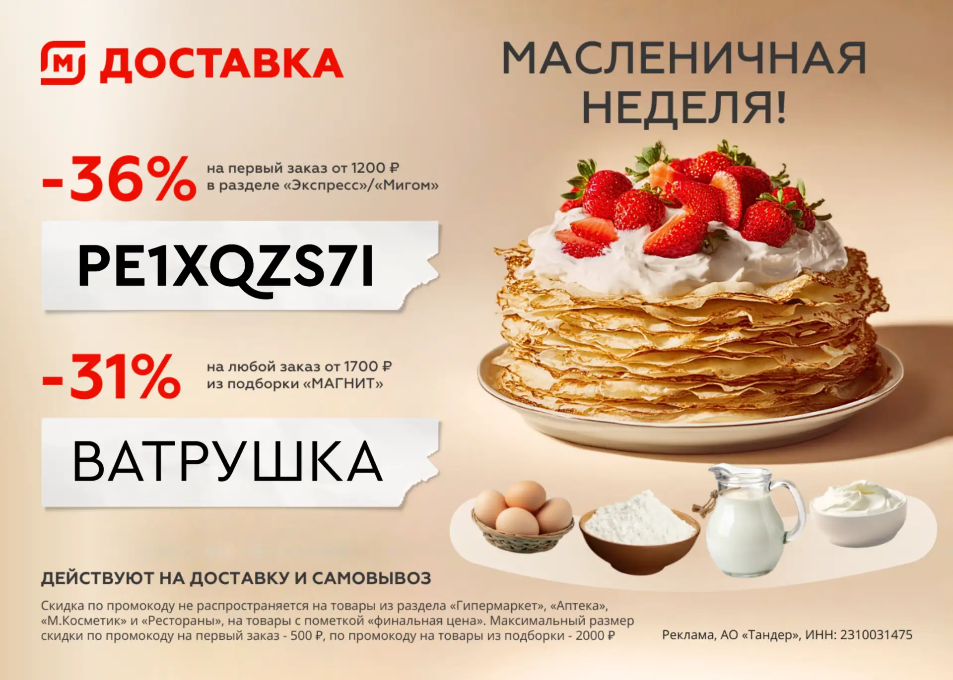 - скидка 36% на первый заказ от 1200 ₽ в приложении «Магнит Доставка» в разделе «Экспресс».