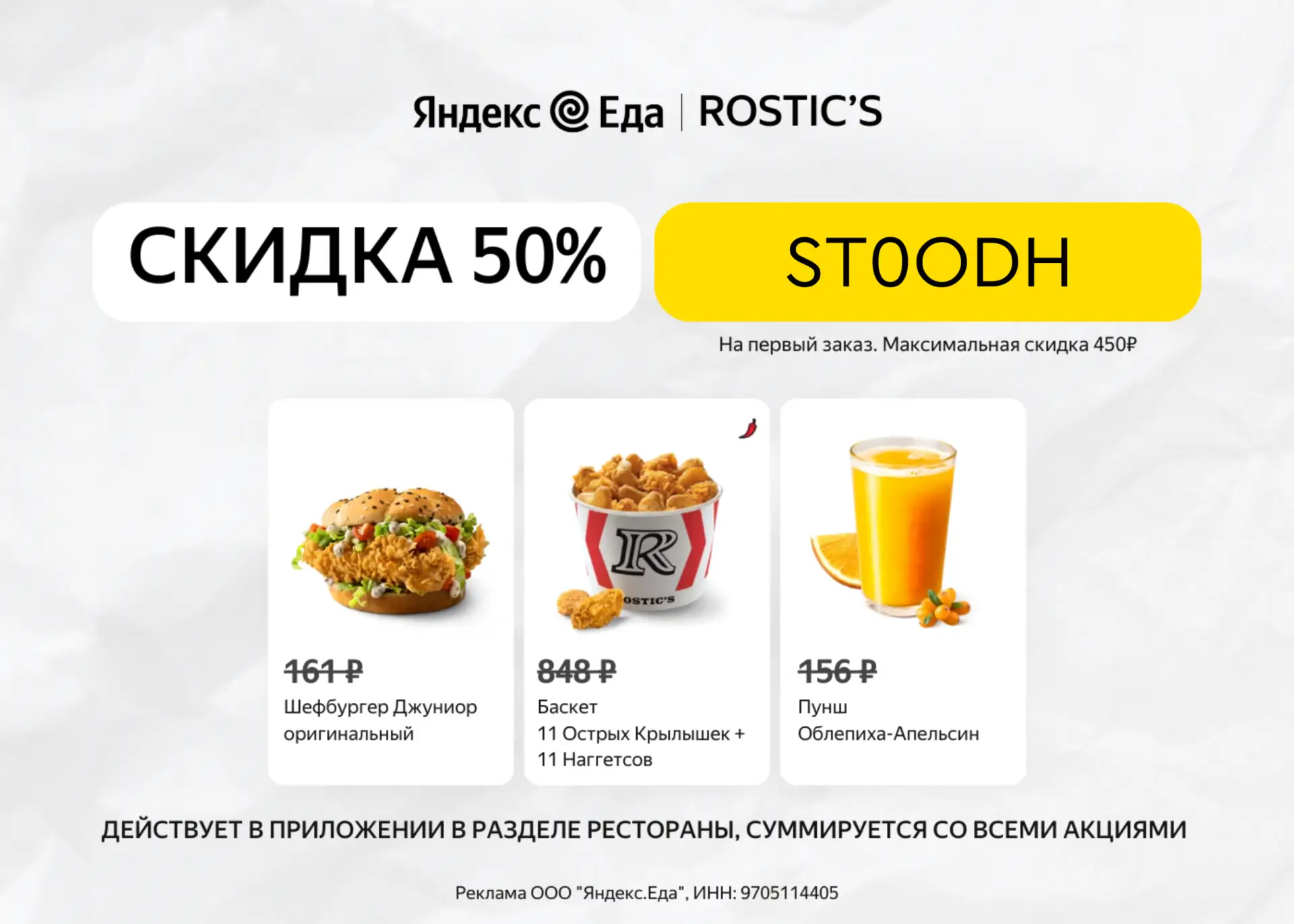 🔥 В сервисе Яндекс Еда в разделе Рестораны появилась новый промокод, скидка 50% на первый заказ от 800 ₽ 📍 - ST0ODH