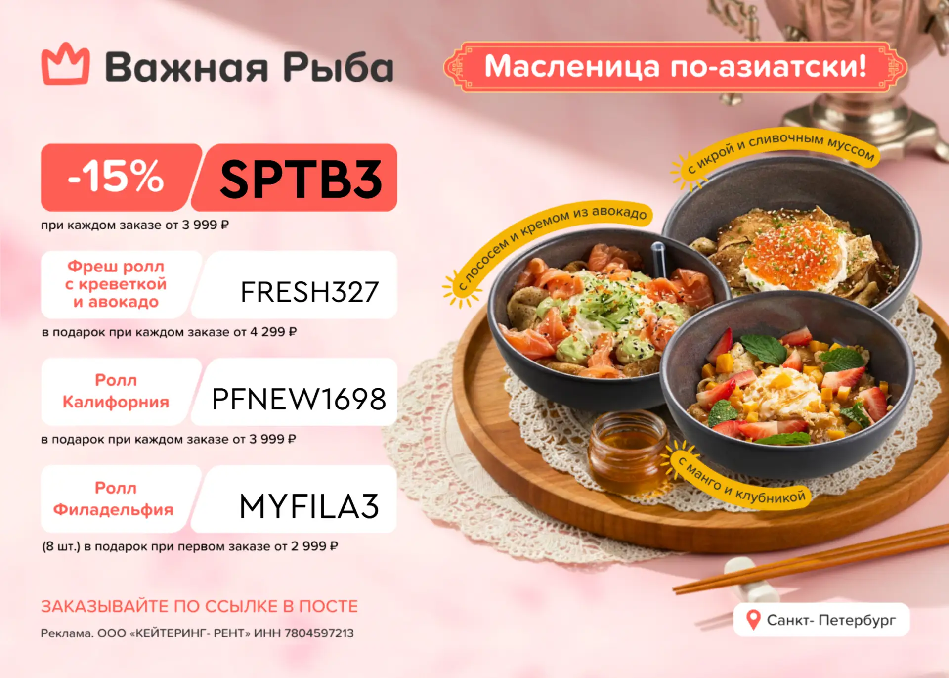 🍣 FRESH327 – Фреш ролл с креветкой и авокадо в подарок при каждом заказе от 4 299 ₽;
