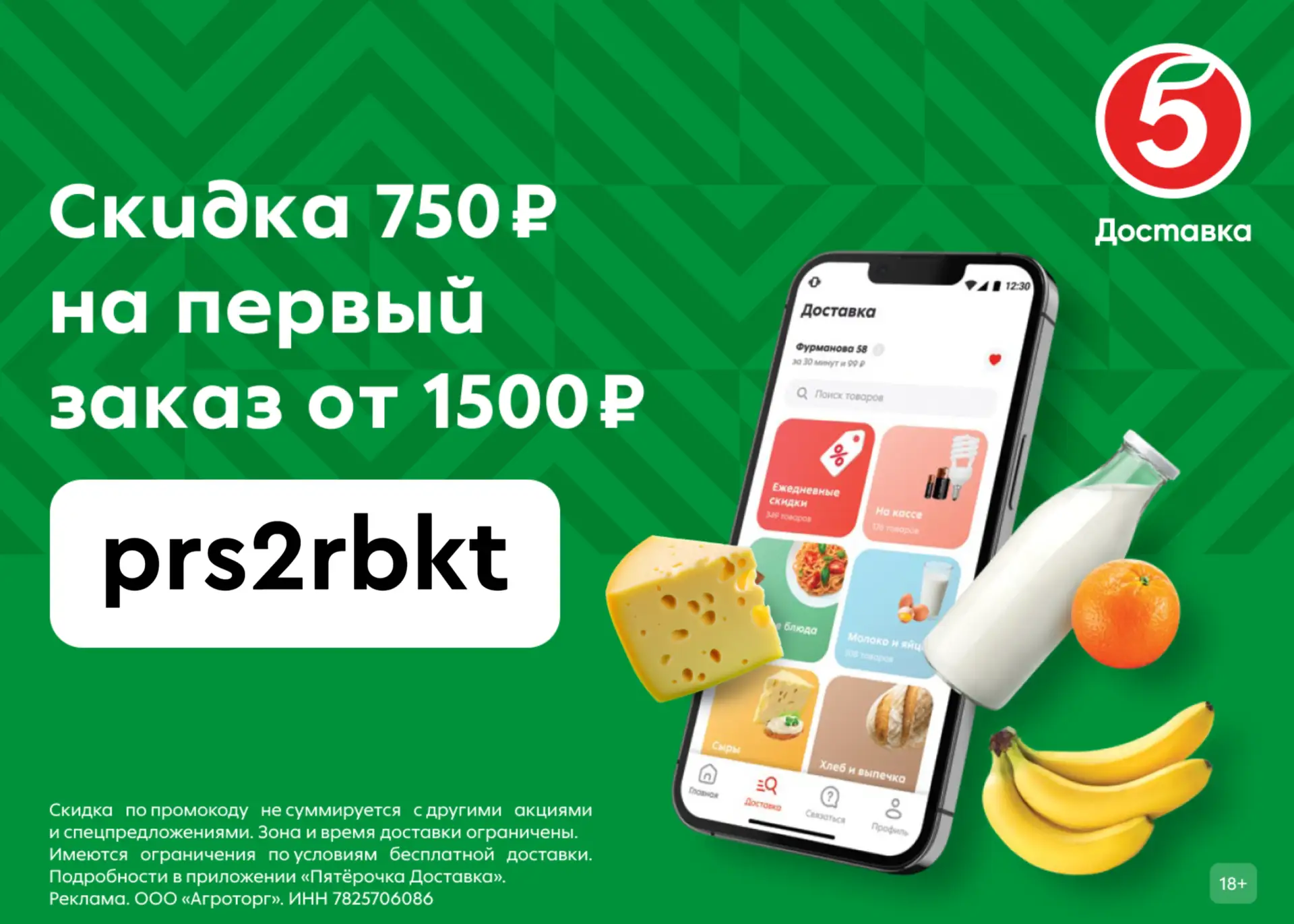Промокод суммируется со скидками в приложении, минимальная сумма заказа 1500₽
