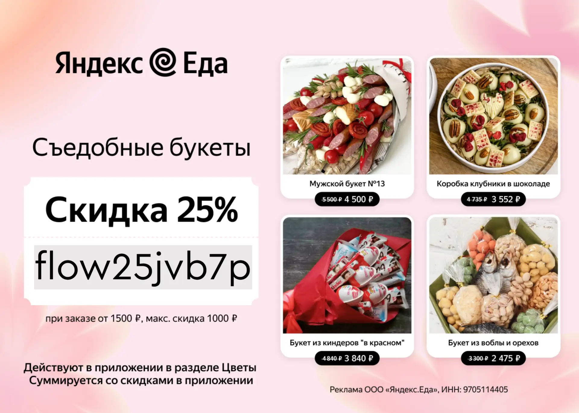 flow25jvb7p — скидка 25% на первый заказ от 1 500 ₽ в разделе Цветы*.