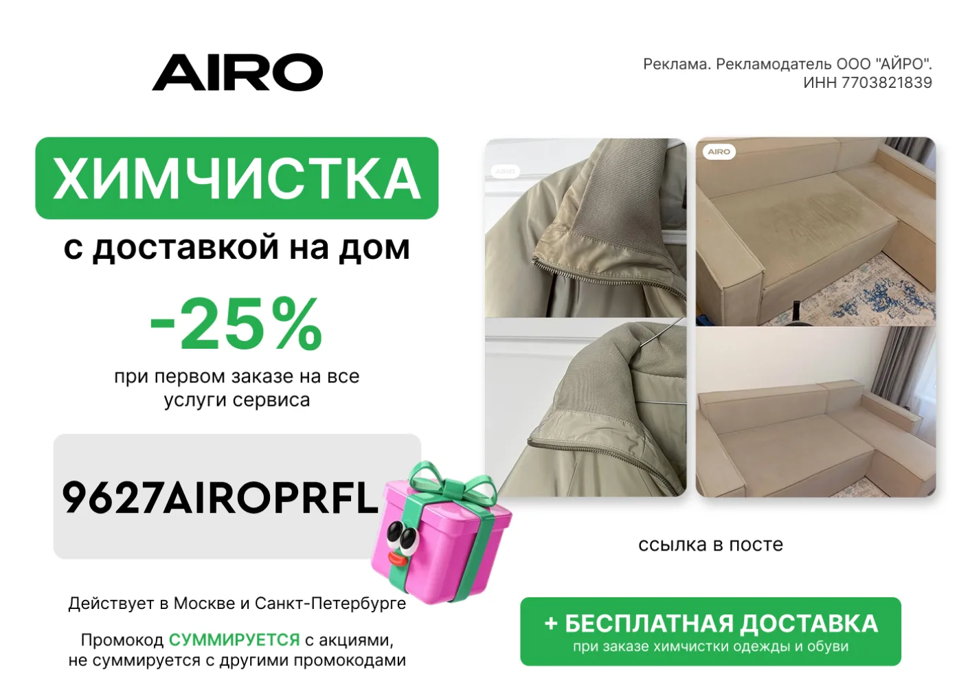 9627AIROPRFL - Скидка 25% при первом заказе любых услуг сервиса + бесплатная доставка при заказе химчистки одежды и обуви.*