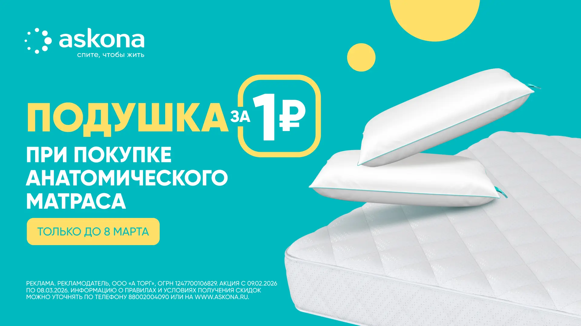 * Акция действует на любое количество заказов в период с 09.02.2026 по 08.03.2026. Количество и перечень матрасов и подушек, участвующих в акции, ограничены.