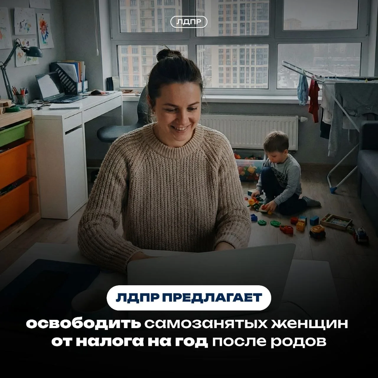 ➡Чтобы поддержать женщин с детьми, ЛДПР предлагает освободить самозанятых матерей от уплаты налога на профессиональный доход в течение года после рождения ребёнка. Так им не придётся прекращать свою деятельность, терять клиентов или вынужденно уходить в теневой сектор.