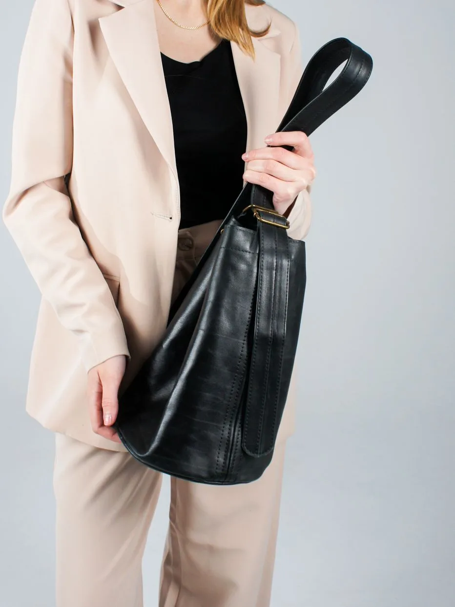 Сумка выполнена из натуральной кожи черного цвета, однако вы можете выбрать понравившийся оттенок из нашей актуальной палитры.
