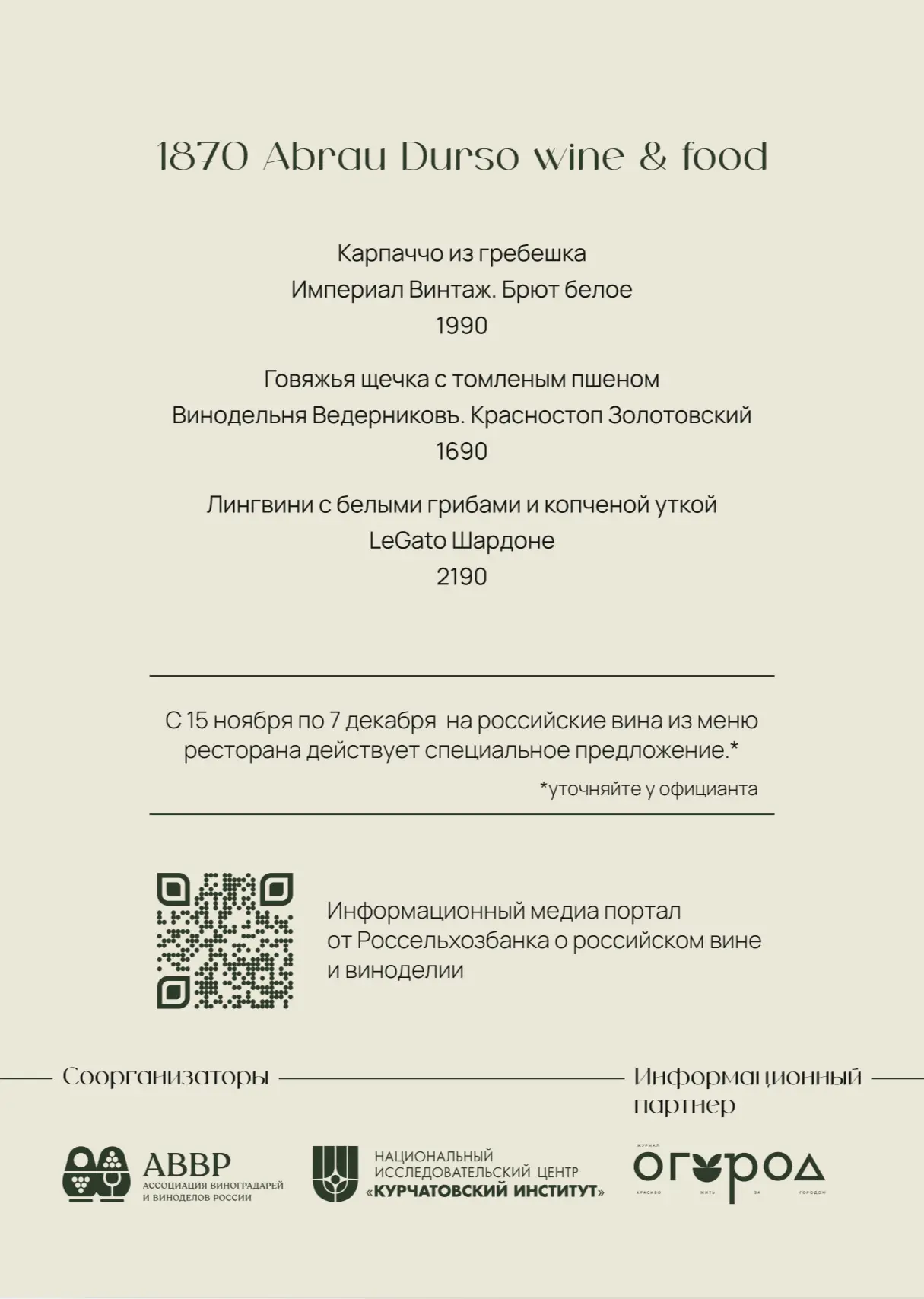 С 15 ноября по 7 декабря гости ресторана смогут попробовать блюда с винными сочетаниями, которые подобрала шеф-сомелье ресторана Янина Мартынюк. Среди прочего, гостям предложат гастрономический дуэт: