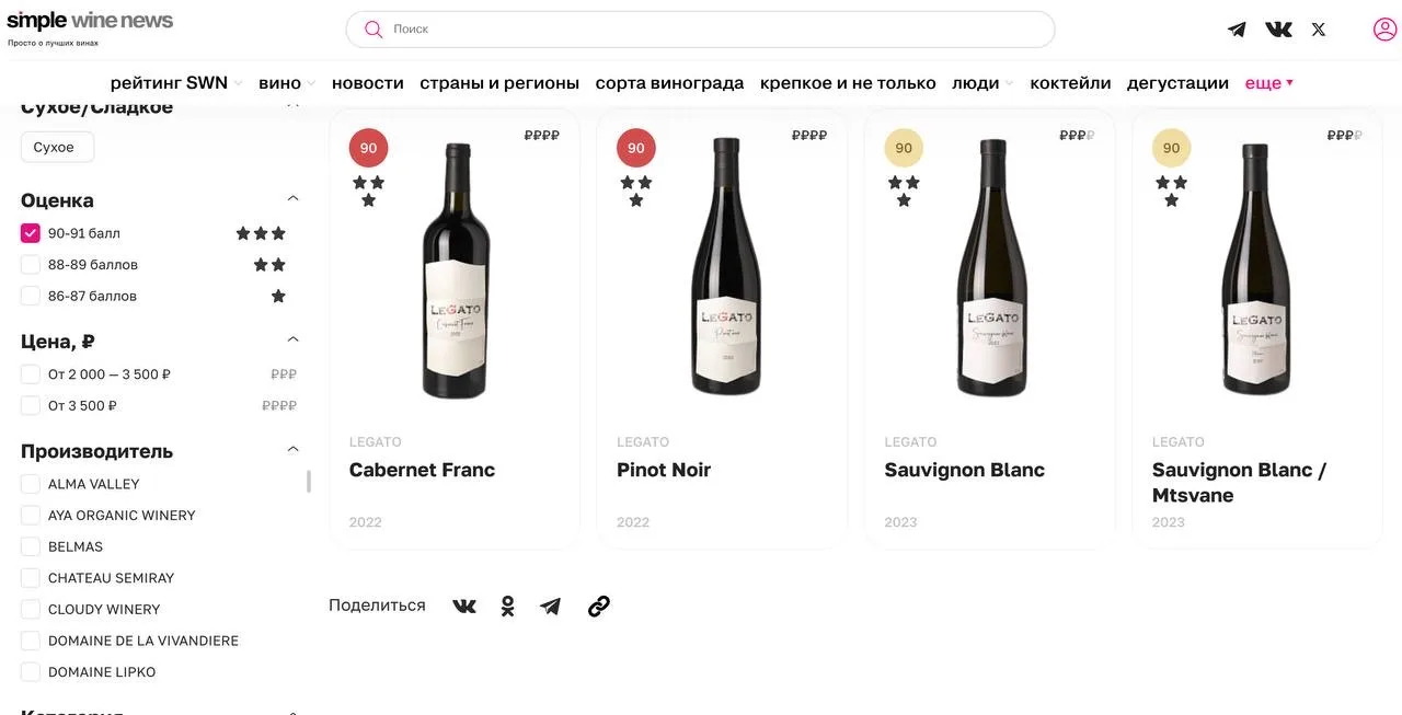 В новом рейтинге «Лучшие российские вина» от Simple Wine News все представленные для оценки вина LeGato вошли в список отмеченных экспертами, а четыре из них (Cabernet Franc 2022, Pinot Noir 2022, Sauvignon Blanc 2023, Sauvignon Blanc Mtsvane 2023) получили 90 баллов и три звезды — подтверждение высокого качества и характерного стиля нашего терруара.