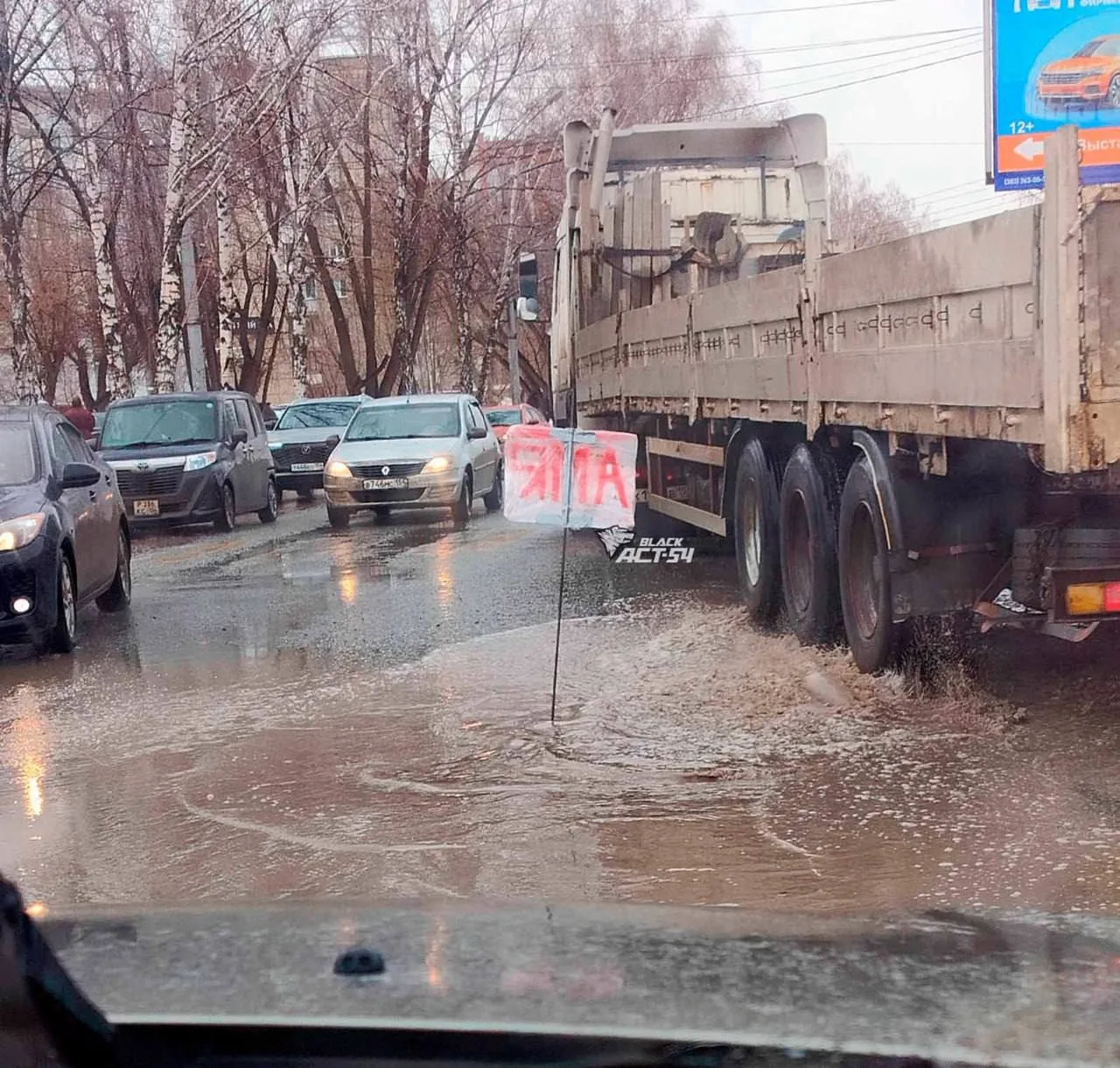 Кто-то позаботился о водителях и обозначил яму, которую скрыла большая лужа на Выставочной