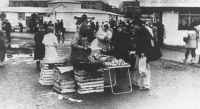 Торговые ряды у входа на станцию метро Площадь Карла Маркса. Кадр 1994 года.