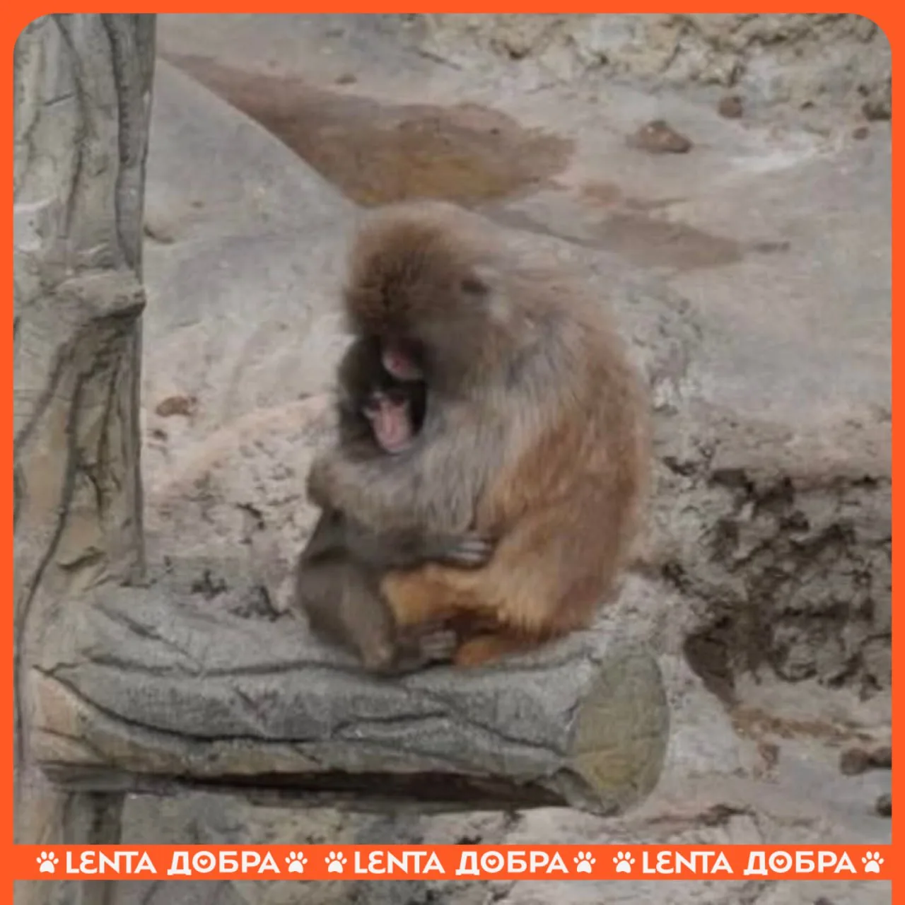 И вот история обрела счастливый конец: одна взрослая обезьяна заметила бедолагу и решила подружиться с ним. Она заботится о малыше и не оставляет его.