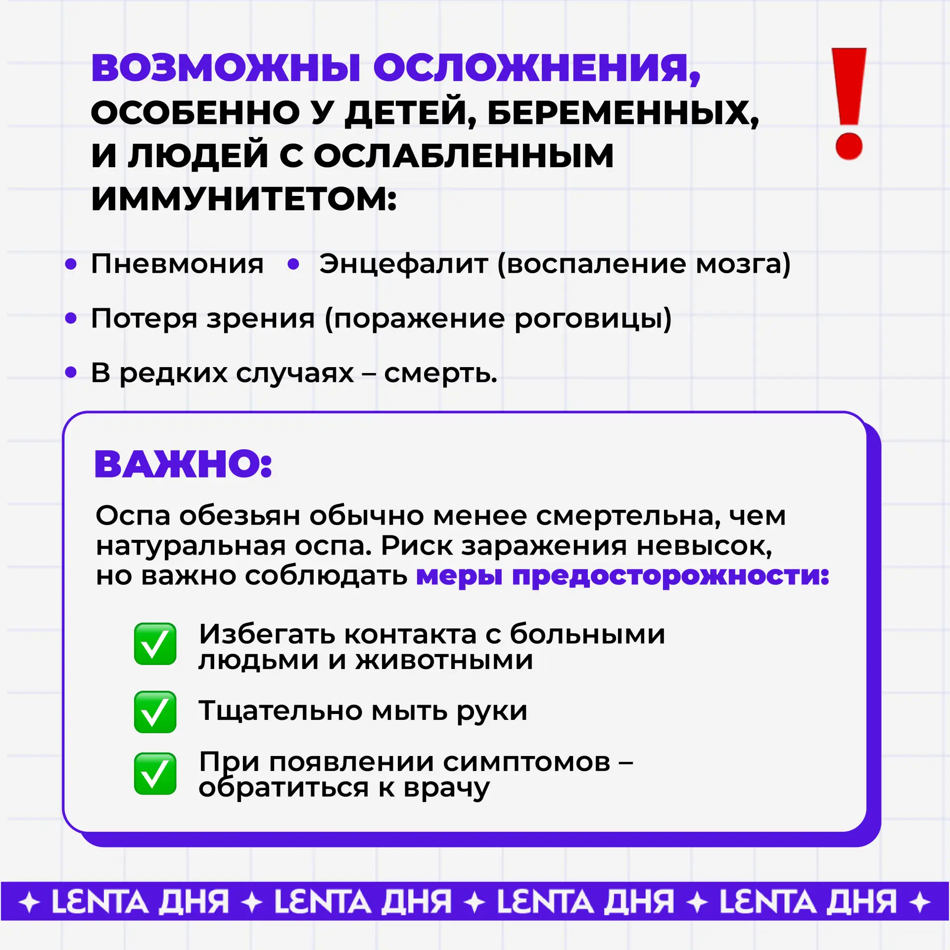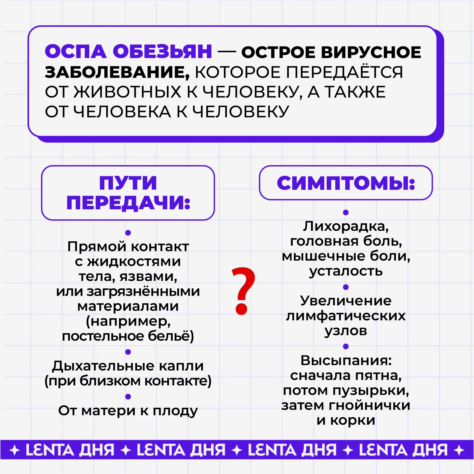 Количество заболевших может вырасти, если не соблюдать меры предосторожности. В наших карточках рассказываем, что такое обезьянья оспа, её симптомы и напоминаем о профилактике