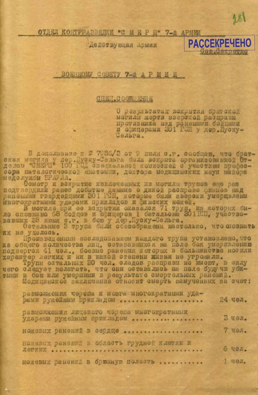 Речь идёт о безжалостных расправах финнов над тяжелоранеными бойцами и офицерами Красной армии в районах Кото-Ярви и деревни Пуску-Сельга. Были обнародованы цифровые копии спецсообщений контрразведки Смерш, которые фиксируют факты массовых убийств и жестоких пыток раненых красноармейцев.