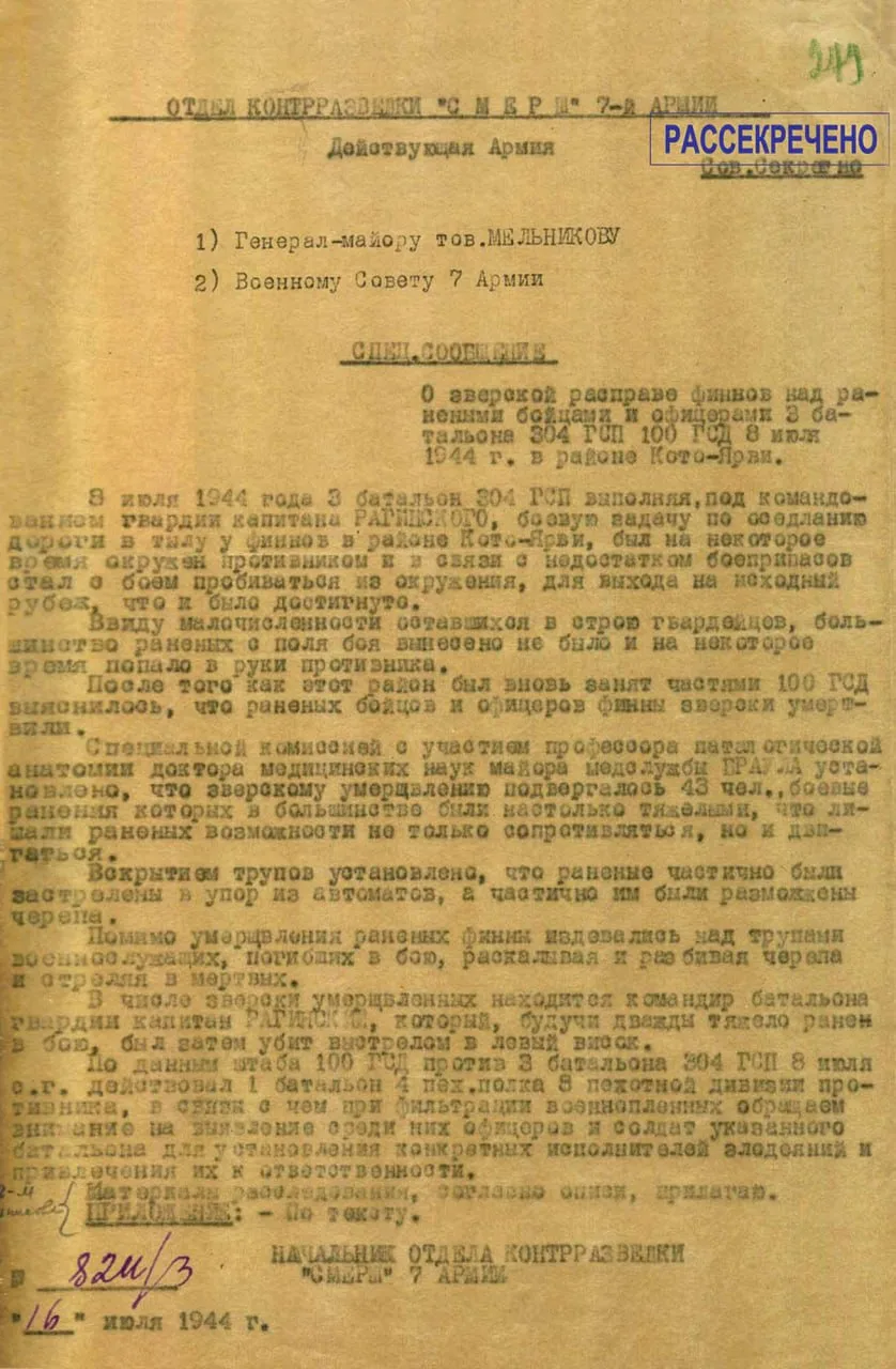 «Изверги глумились над ранеными советскими воинами. Они добивали раненых. Они сожгли санитара Русина. Они распарывали ножами животы у наших бойцов. Они вырезали на груди гвардейца Гришкина гвардейский знак. Маннергеймовцы зверски умертвили 41 раненого бойца. У гвардии лейтенанта Сыч расколот череп, выколоты глаза. Они нанесли гвардии красноармейцу Князеву пять штыковых ран. Он умер мучительной смертью. У гвардии сержанта Артёмова они изрезали лицо ножом. Изверги размозжили многим раненым бойцам головы прикладами, распороли животы финками».