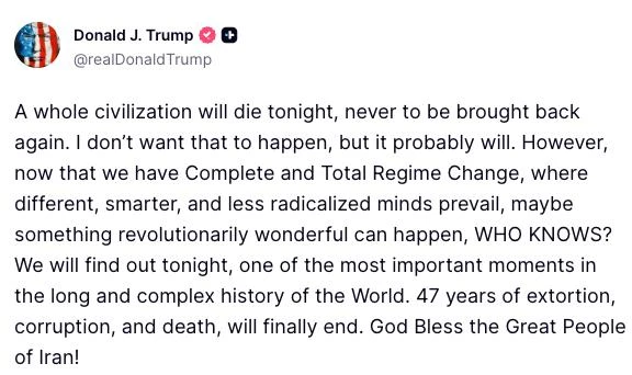 Сегодня ночью погибнет целая цивилизация, и её уже никогда не возродят. Я не хочу, чтобы это случилось, но, вероятно, так и произойдёт. Однако, теперь, когда у нас произошла полная и тотальная смена режима, когда преобладают другие, более умные и менее радикальные умы, возможно, произойдёт нечто революционно прекрасное, КТО ЗНАЕТ? Мы узнаем это сегодня ночью, в один из важнейших моментов долгой и сложной истории мира. 47 лет вымогательства, коррупции и смерти наконец-то закончатся. Да благословит Бог великий народ Ирана! - Трамп