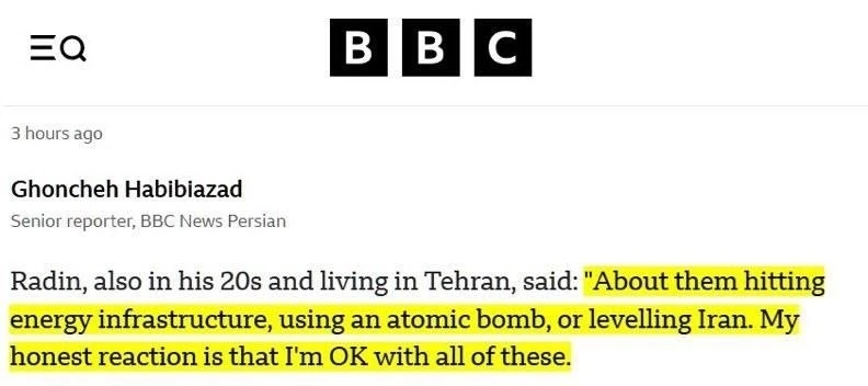 Так, в репортаже британского BBC цитируется некий иранец в Тегеране, который говорит, что он готов принять даже самые экстремальные последствия войны, включая ядерную атаку или полное уничтожение. Этот анонимный «житель Тегерана» заявил ВВС: