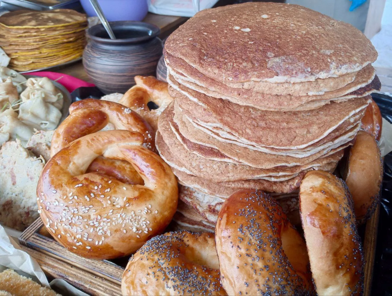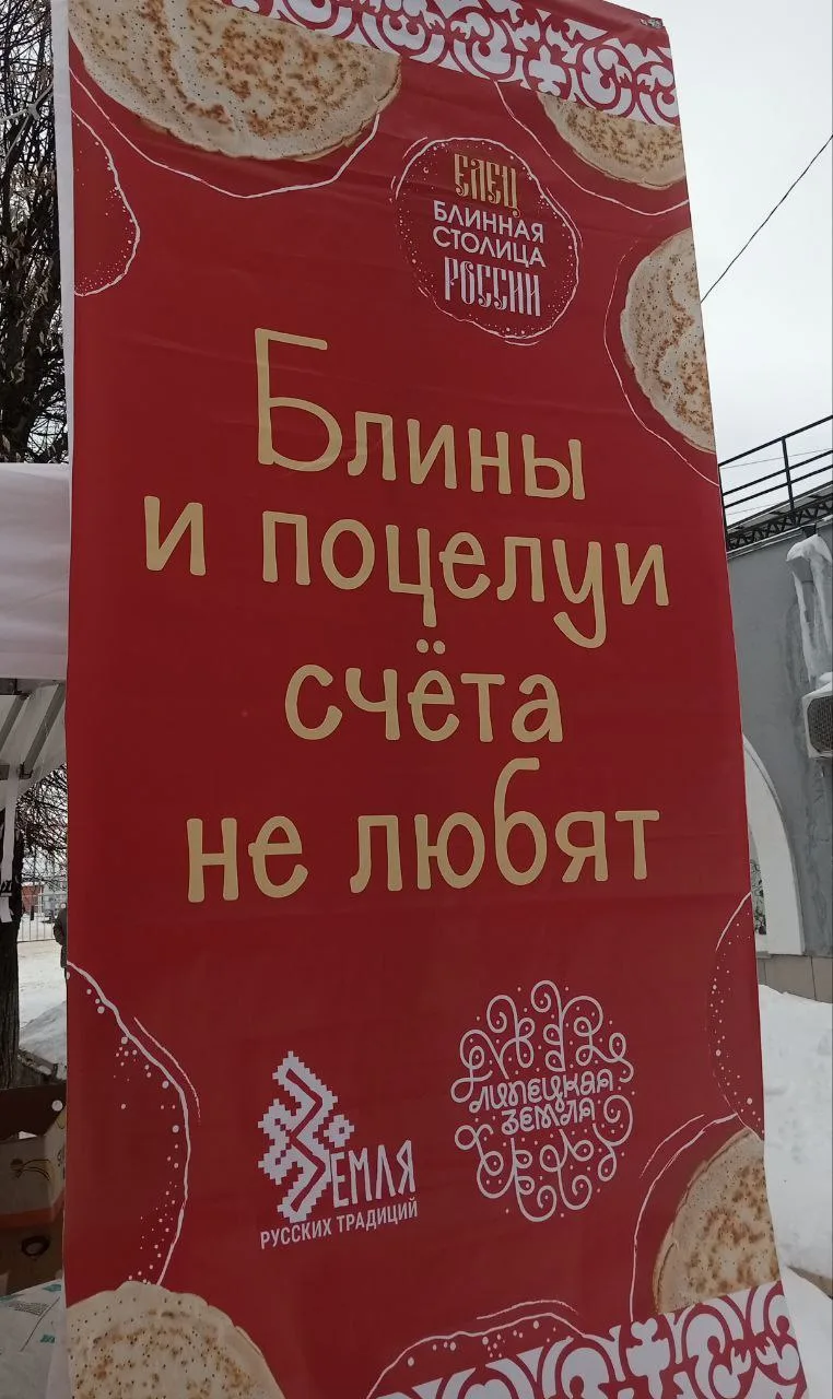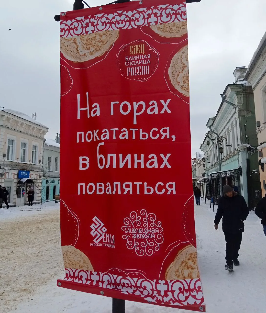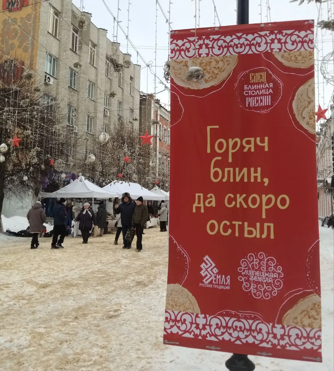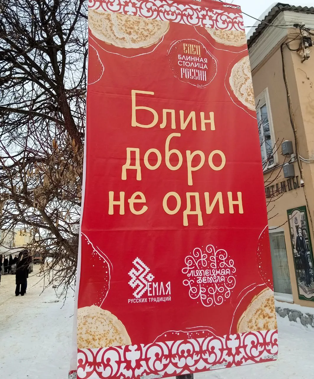 Главное угощение – гречневые блины по дореволюционным рецептам. Также везде висят блинные надписи.