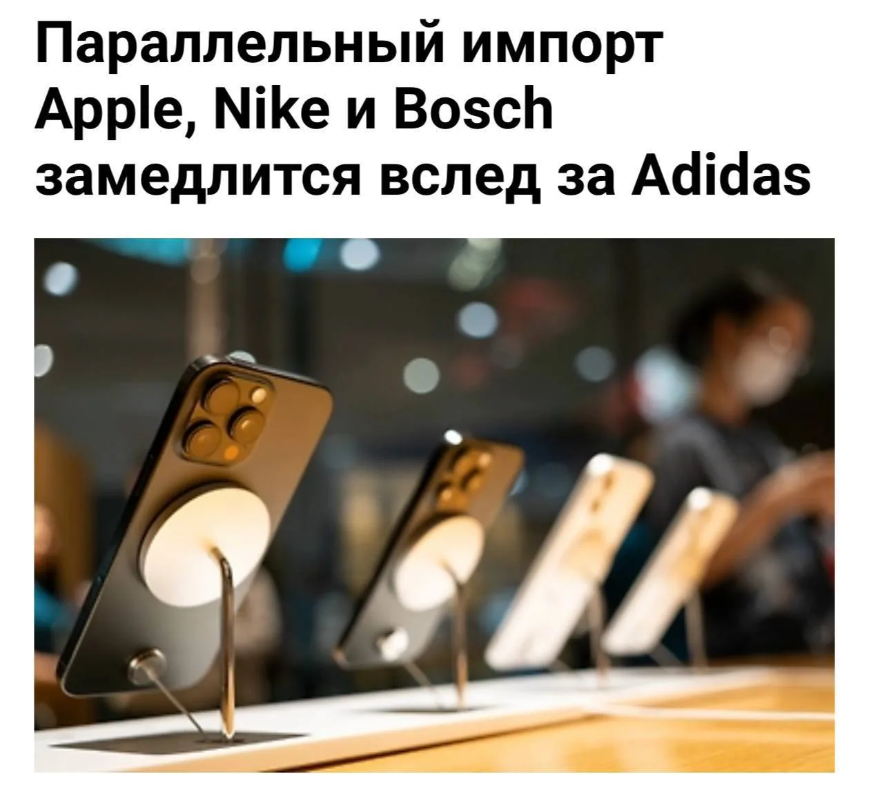 Параллельный импорт в России умирает, а цены на товары резко взлетят — поставки Apple, Nike, Bosch, HP, Dell, LG Electronics, ASUS и других брендов замедлились, пишет мэш. Эксперты прогнозируют дефицит и рост цен в ближайшие месяцы.